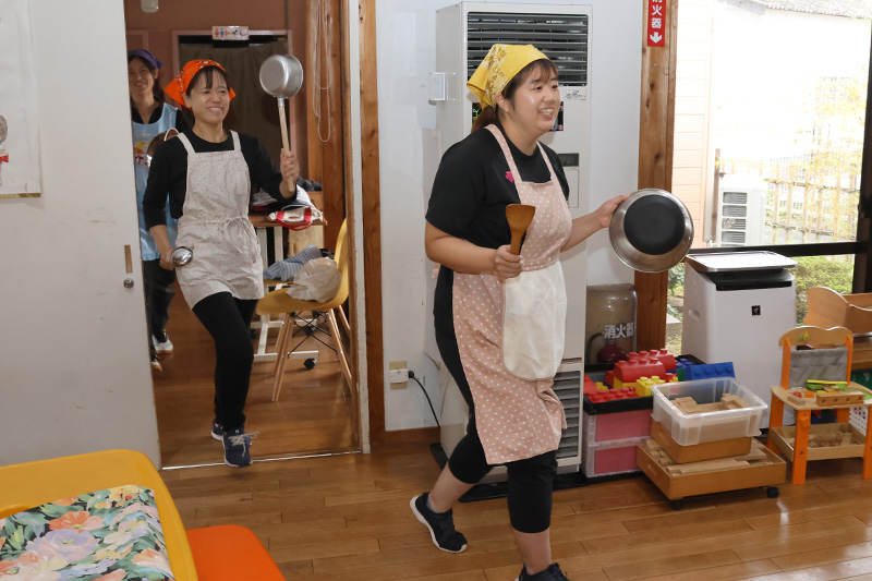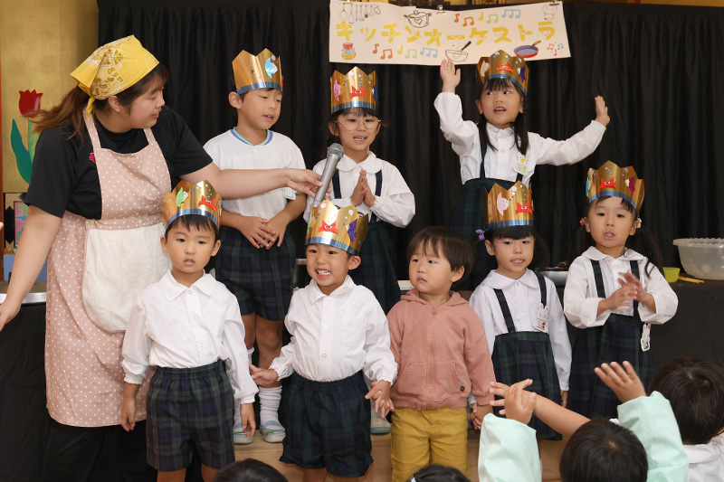10月22日、10月生まれと11月生まれのお友だちの誕生会を開きました。つぼみ組1名、もも組2名、すみれ組2名、さくら組3名の総勢8名の誕生児さんでした。いつものように冠のプレゼントとインタビューが終わると先生たちからの出し物のプレゼントなのですが・・・調理器具を手にした先生たちが3分クッキングのテーマ曲(もとは『おもちゃの兵隊のマーチ』)を鍋やフライパンを打楽器のようにヘラや菜箸で鳴らしながら登場!?