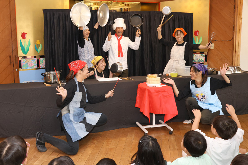そうです!今回の出し物は『キッチンオーケストラ』だったのです。大きな鍋のフタがシンバルのような音を出したり、ひっくり返したボウルや鍋を叩くとなんとなくそれっぽい音階に聴こえてきたり・・・耳馴染みのある曲だったこともあって錦華っ子たちも大喜び。ジャムおじさん?も参加して賑やかなキッチンでは最後にホットケーキが焼き上がりました。10月と11月生まれの先生たちに前に出てもらって大きなひと口のホットケーキをサプライズプレゼントლ(´ڡ`ლ) 。みんなの笑顔が弾けた楽しい愉快な誕生会でした!