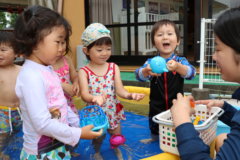 つぼみ・もも・すみれ組はプール遊びをしています。回を重ねるごとに水の中での遊びも大胆になっています。同時に、体操服の着脱や身体の拭き上げなどもとても上手になっている子どもたちです(^_^)v。