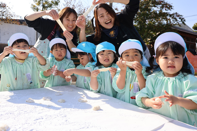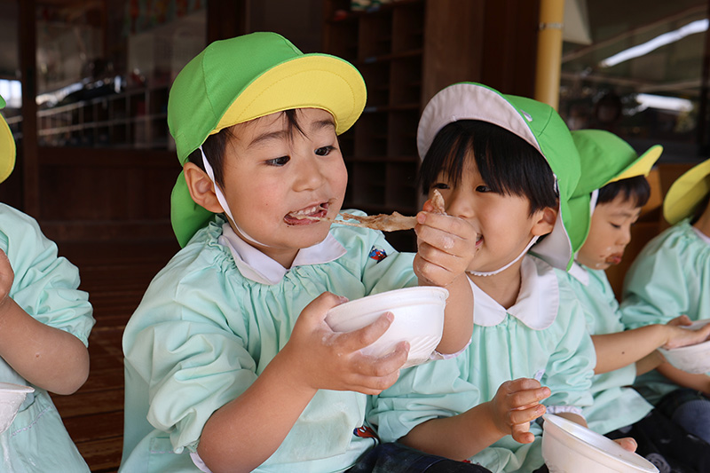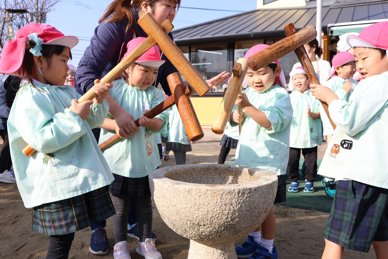 今日は餅つき大会でした。濃霧が立ちこめる朝でしたが、霧が晴れる頃には気温も上がってきて最高の餅つき日和となりました。まずはふかした餅米をそれぞれのクラスでひと口ずつパクリ。噛んでいくといつものご飯とは違った食感と味わいに気づきました。それから、すみれ組→つぼみ組→もも組→さくら組の順番で餅つきをしました。はじめに各クラスのお父さんたちに餅をついてもらうのですが、大きな杵でつく迫力のある音や、リズミカルな高速餅つきに目を丸くしていた錦華っ子たちでしたね。