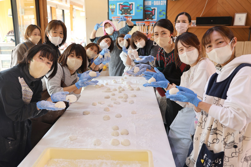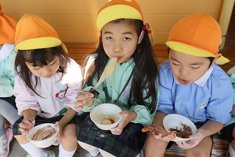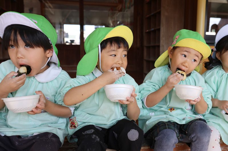 続いて錦華っ子たちの出番です。つぼみ組やもも組はかわいらしく、すみれ組やさくら組は力強く餅つきをすることができました。そんな子どもたちの様子を見守る保護者さんの眼差しは、毎回のことながらとても優しく温かでした。つきあがった餅は小さくちぎってもらってから、餅とり粉を手につけて子どもたちが自分で丸めます。柔らかいお餅に触れて思わずビローンと伸ばしてしまう子も(´∀`;)。お餅を丸めたら好きな味付け(チョコ餅・きなこ餅・醤油のり餅)をして「いただきまーす」。錦華っ子も保護者さんもオカワリをして大満足の餅つき大会でした!