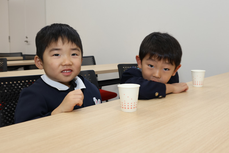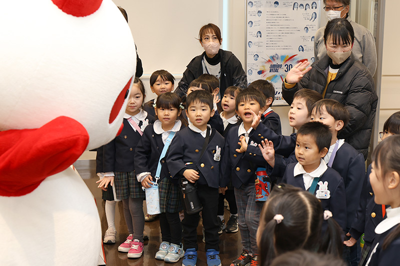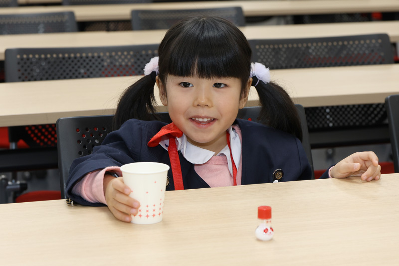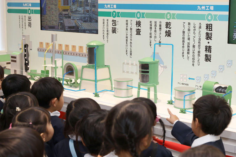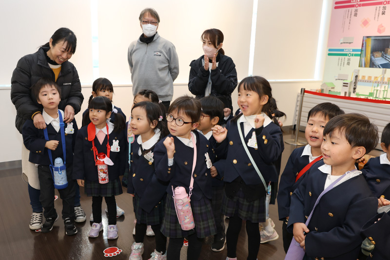 すみれ組、全員出席で諸富にある味の素の工場見学に出かけてきました!錦華幼稚園としては2019年11月以来、約6年ぶりの味の素工場見学となりました。味の素の歴史をひもとく動画を見た後で、みそ湯で旨味体験をさせていただきました。みそを溶いただけのみそ湯をまずひと口ゴクリ・・・うーん、何か物足りない→味の素をパッパッと二度ふると・・・あれ?美味しくなったよ!ლ(´ڡ`ლ) 。年中児にも体感できる、さすがの説得力の味の素でした。それから味の素のバスに乗り込んで工場内見学バスツアーへ。複雑に並ぶパイプラインや大きなタンクに驚きつつ、バスに向かって優しく手を振ってくださる従業員の皆さんに嬉しそうに手をふり返すすみれ組さんでした。見学棟に戻ってくると、そこには可愛い西村さん・・・もとい、味パンダが待っていてくれました。味パンダと一緒に記念撮影。最後に嬉しいお土産をもらって大満足で幼稚園に帰りました。すみれ組のみんな!スーパーにお買い物に出かけた時はおうちの人に味の素製品を推すんだぞ!冷凍餃子とかガッツギアとか٩(•̤̀ᵕ•̤́๑)
