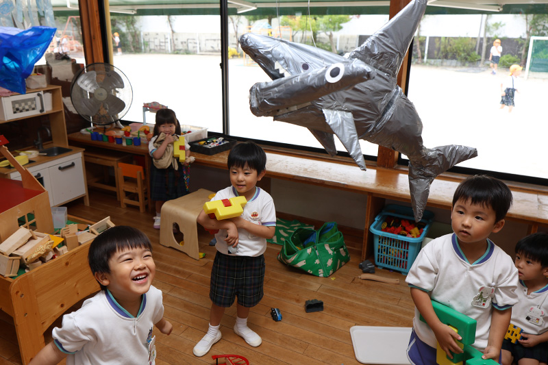 もも組ではチャレンジ走に使ったいろんなサカナたちを吊るして飾っています。これも運動会の余韻の楽しみ方。担任が工夫してまるで水族館のような雰囲気になっていました。もも組さんはとっても嬉しそうでしたし、廊下を通る他のクラスの子たちも興味津々にサカナたちを見上げていました。