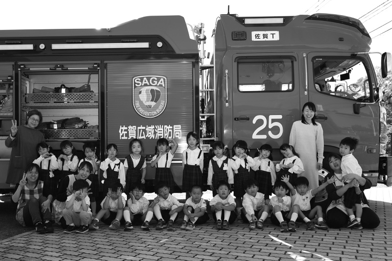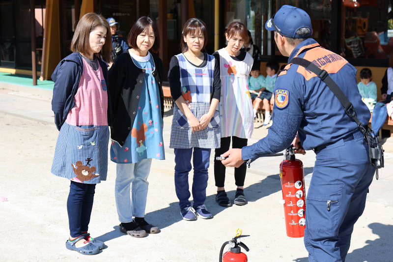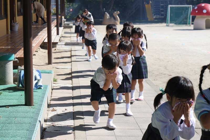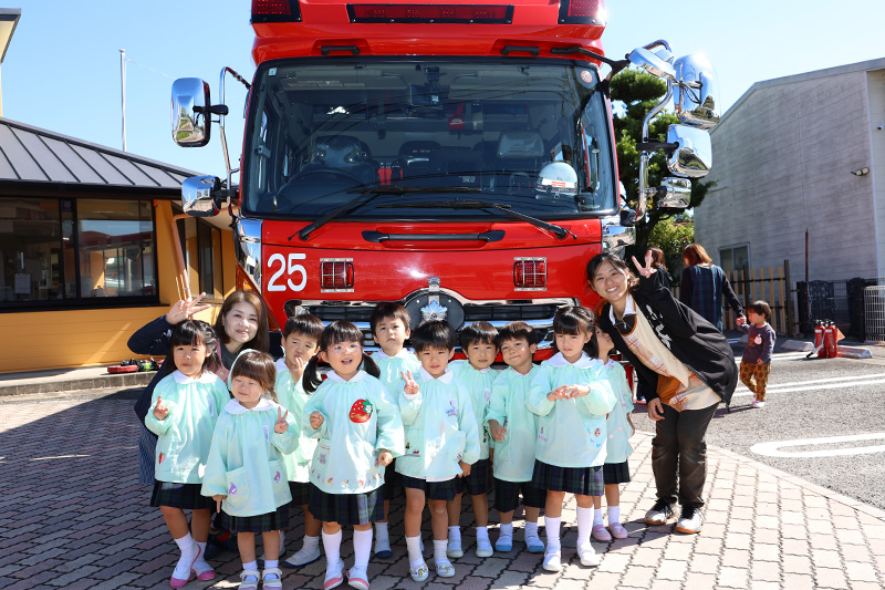 大切な『お・か・し・も・ち』の話を消防士さんから聞いた直後に、私が「大切なお話を聞いたね。〝わらびもち〟だったかな?」と言うと、主にさくら組さんたちは「ちがう!」と声をあげていました。それでも調子に乗って「わ・ら・び・も・ち、の〝わ〟は何だったかな?」と尋ねると、これまた調子に乗った先生が「わらわない!」と気の利いた返答。続けて「〝ら〟は何かな?」と尋ねると「らくだ!?」、「じゃ〝び〟は何かな?」と尋ねると、別の先生が「びっくりしない!」となかなかの答え。そんなやり取りを遠くで聞いていた消防士さんはクスッと笑っていたそうです。怒られなくてよかった・・・(´∀`;)。みんな、『お・か・し・も・ち』だからね!
