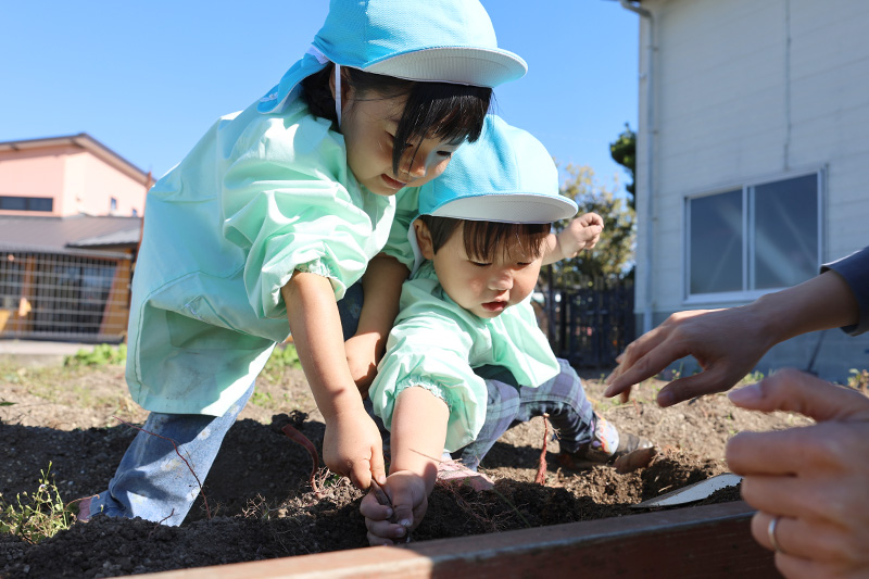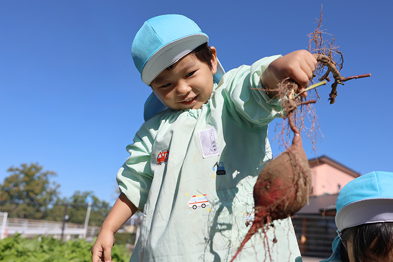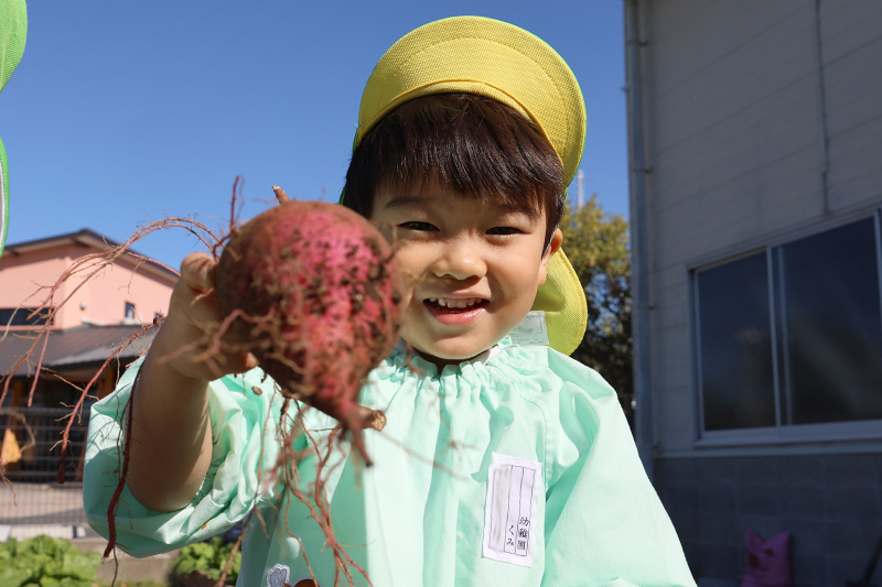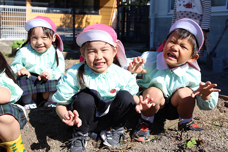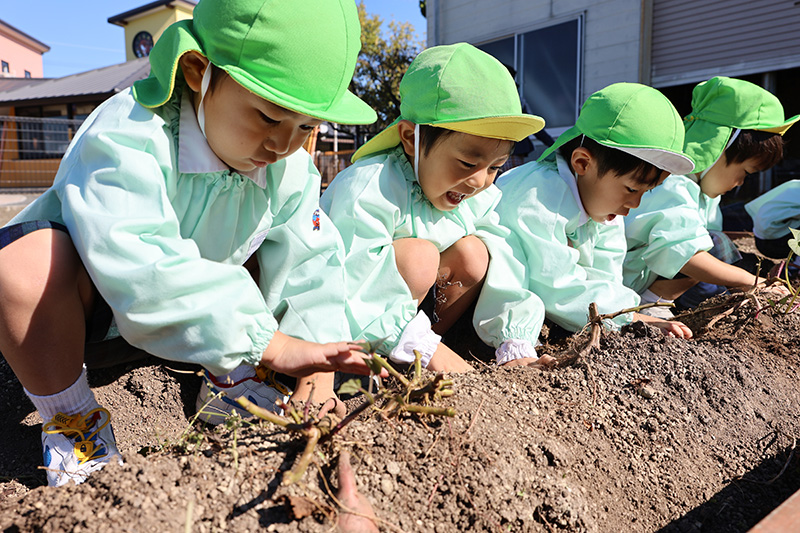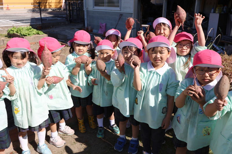 今日は、つぼみ組・もも組・すみれ組が芋掘りをしています。芋畑の土は園児の手でも掘れるくらいの固さなのでシャベルなどの道具は使わずに掘っています。事前に子どもたちに伝えるのは「モグラの手にして掘るんだよ!」ということ。みんな指先にギッ!と力を入れてガシガシと土を掘っていましたよ٩(•̤̀ᵕ•̤́๑)。形や大きさは様々でしたが、自分で掘り上げたお芋を嬉しそうに見せてくれていました。ちなみに今日、持ち帰っているサツマイモは紅はるか・・・のはずです、多分(´∀`;)。さくら組は明日芋掘りをします。欠席だった子は登園でき次第芋掘りをしますよ。
