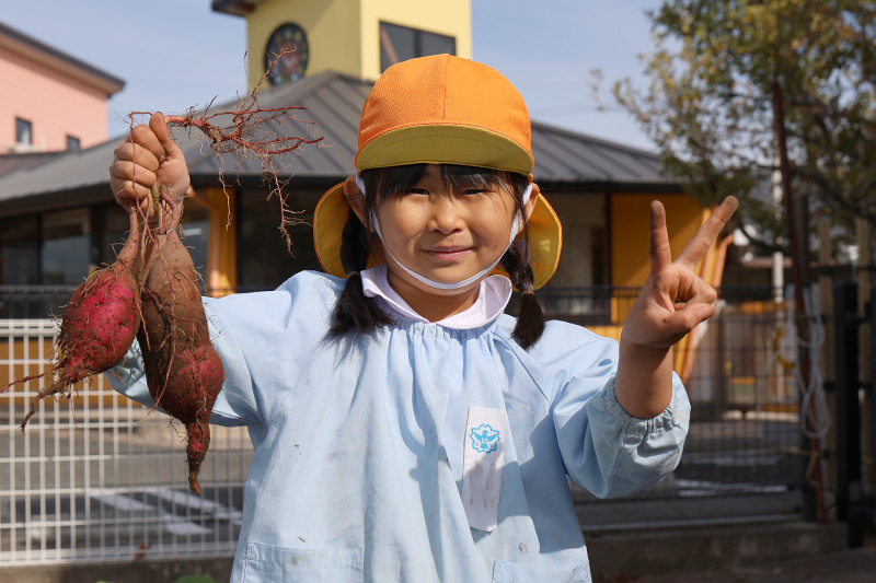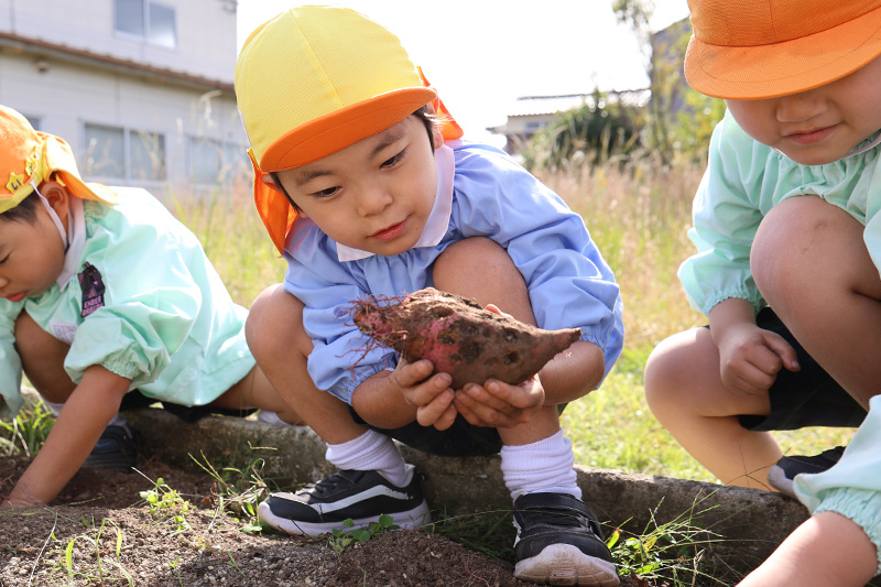 昨日に引き続き、今日はさくら組が芋掘りをしています٩(•̤̀ᵕ•̤́๑)。さすがのさくら組、モグラの手も強力でガシガシ掘ってはドンドン芋を掘り上げていました。先日、払っていた芋づるを片付けてお手伝いをしてくれたさくら組さんには、お礼として紅はるかと紅あずまを1個ずつ持ち帰ってもらいました。食べ比べてみたらきっとその違いに気づくはず!?ლ(´ڡ`ლ) 。ご家庭でどっちがどっちクイズを楽しんでみてください!もし、こちらの手違いでどっちも同じ芋だったらすみません(´∀`;)。