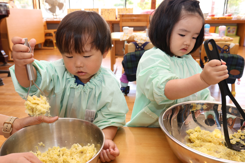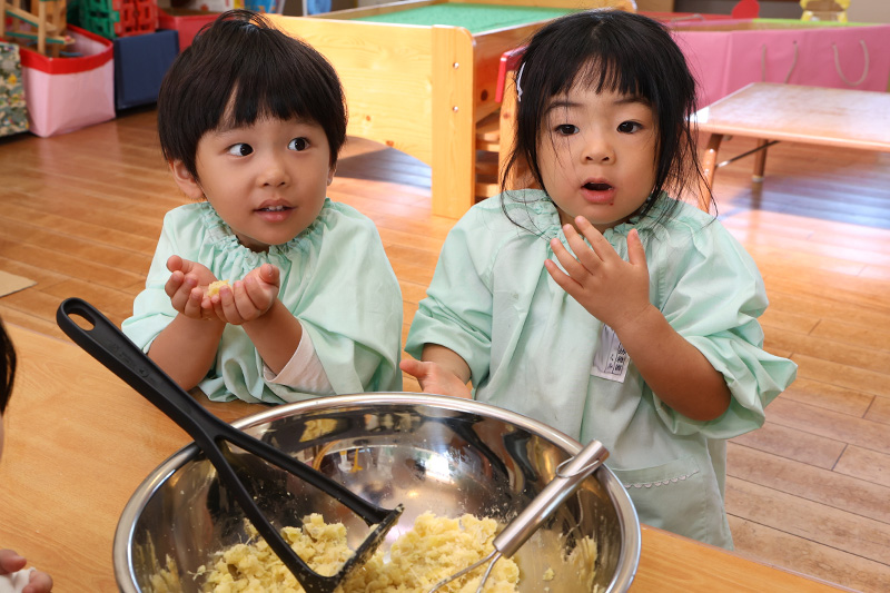 つぼみ組、お芋を洗って蒸し器で蒸して、砂糖や塩、バターに豆乳を加えて、みんなでグイグイとマッシュしました。明日、つぼみ組は保護者参加で循誘公民館でパン作りをします。今日は前準備としてさつま芋パンのタネ作りをしたのでしたლ(´ڡ`ლ) 。完成したタネをほんの少し味見をすると「おいしい!」と輝く笑顔のつぼみ組さん。勝手に味見のオカワリをしようとする子もいました(´∀`;)。明日のパン作り、楽しみですね。つぼみ組保護者の皆さま、よろしくお願いします。