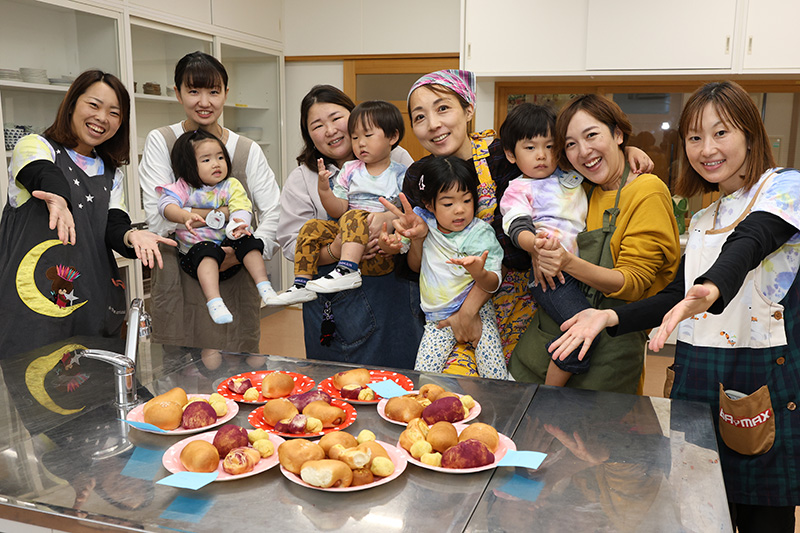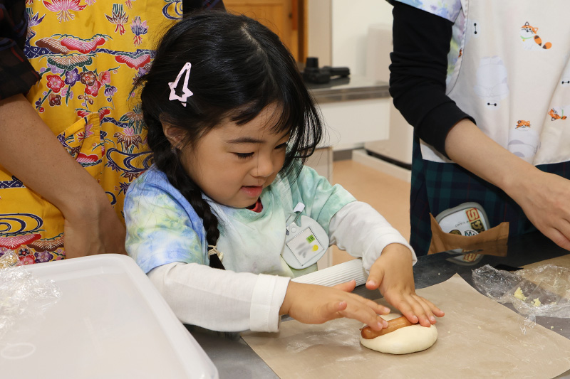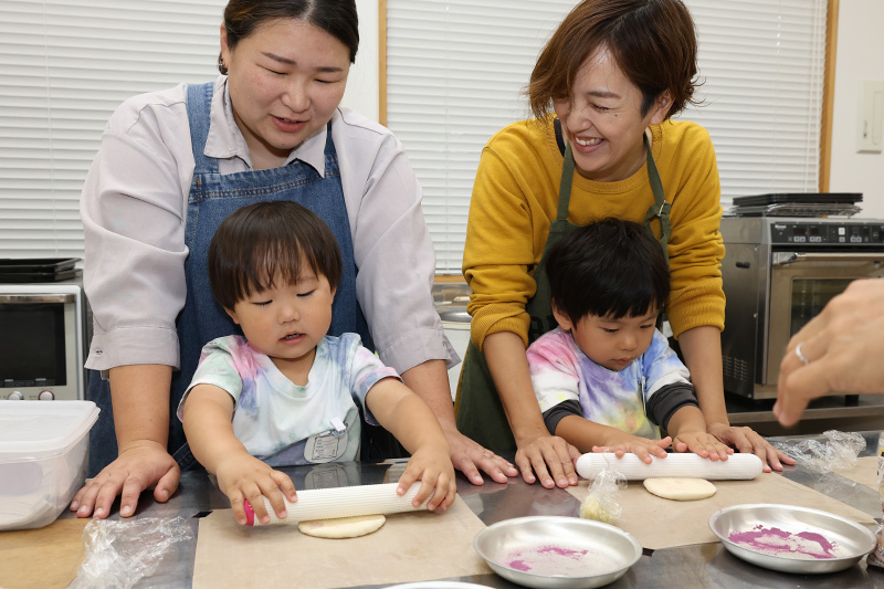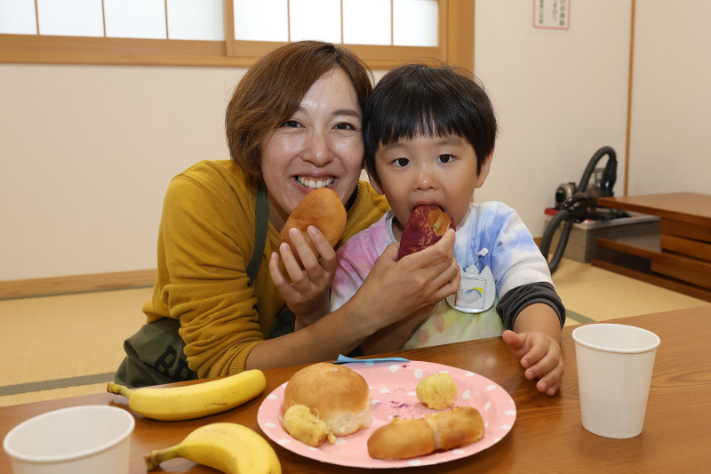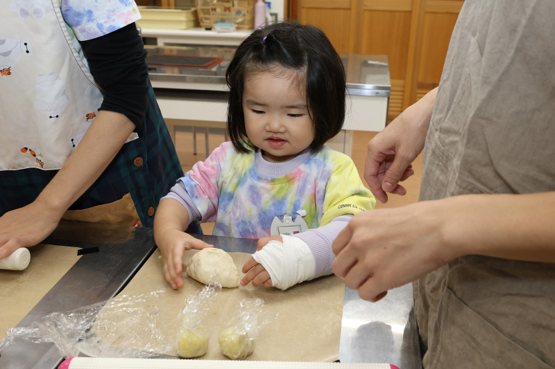 二次発酵前のパン生地を親子で丸く伸ばして、昨日作っておいたさつま芋のタネを包んだり、ウインナーをクルリと巻いたり・・・ちびっこパン屋さんが活躍する姿はとっても可愛かったですよ(๑′ᴗ‵๑)。紫芋の粉をまぶしたパンは本当にお芋みたいでした。焼き上がりを待つ間は公民館の和室で絵本を読んだり、遊んだり・・・。