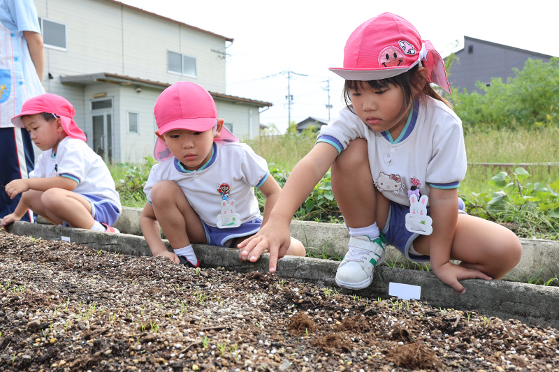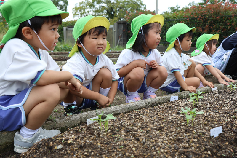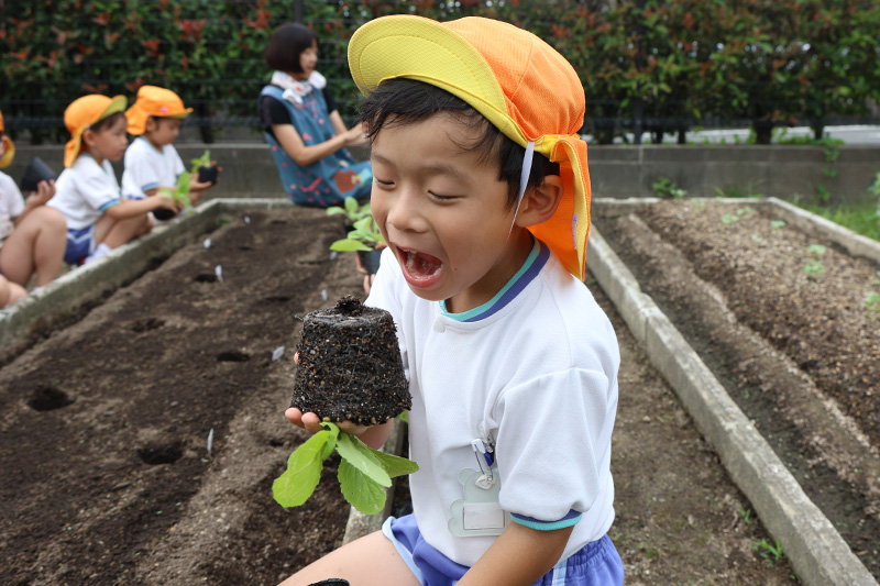 さくら組、白菜の苗を畑に引っ越しさせています。ポットから根っこのプリンを取り出す作業もこれが最後。これからしっかりお世話をしようね!すみれ組の人参、もも組&つぼみ組の大根も目出たく芽が出ています。久しぶりに「大きくなぁれ!」の声が響いた錦華畑でした。