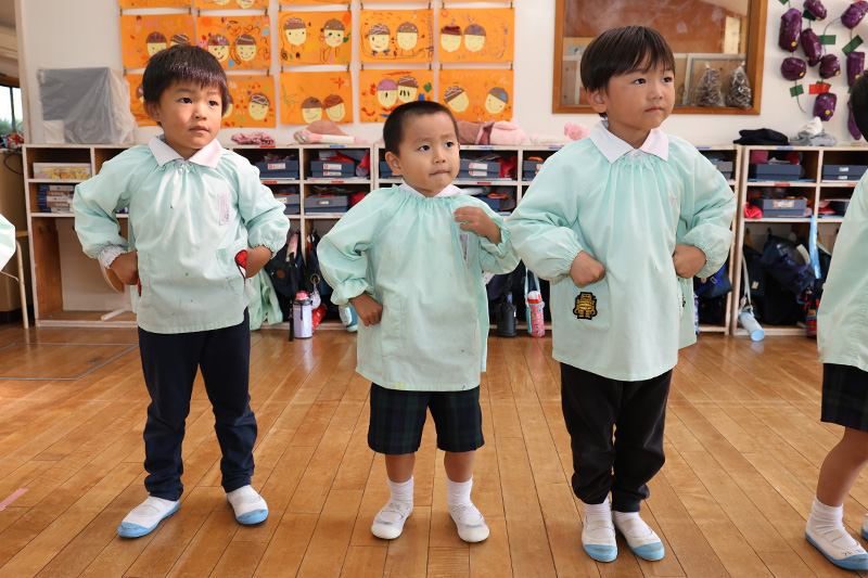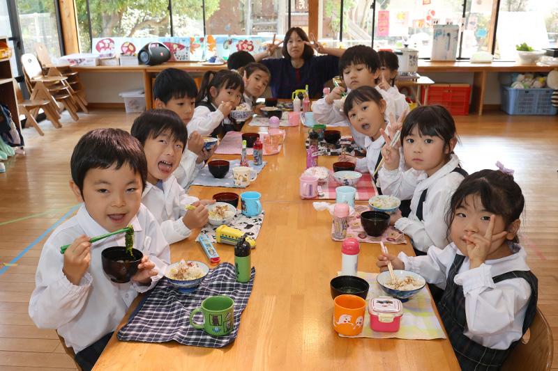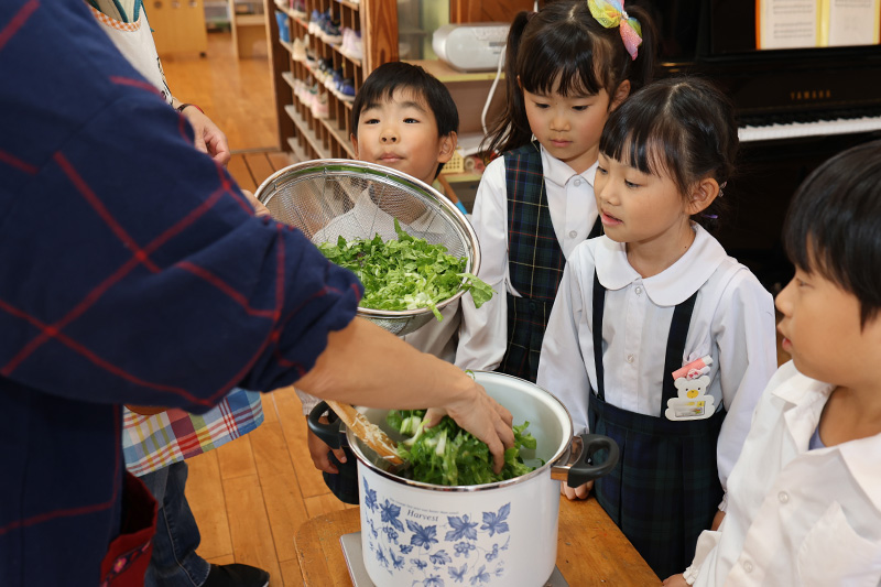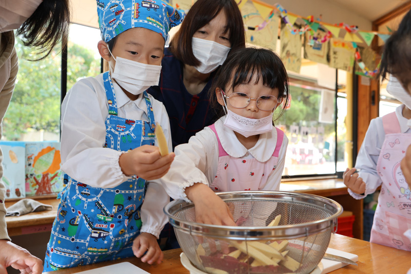 さくら組、今日は嬉しいクッキング『お芋ご飯&白菜スープ』作りでした。お芋はもちろん錦華畑で収穫した紅はるか、白菜はさくら組が育てている〝きょうゆめちゃん〟から柔らかい葉を一人3枚とりました。お芋ご飯は2種類。スティック状の芋を包丁でサイコロ大に切って炊き込んだものと、お芋をそのままドンと2本入れて炊き込んだもの(どちらも白だし入り)を作りました。炊飯の間に錦華畑に白菜をちぎりに行って、しばし遊戯練習٩( ᐛ )و。炊飯器から上がる湯気の香りにすっかりお腹を空かせていたさくら組さんでした。白菜とエノキとシャウエッセンを入れてコンソメと岩塩で味を整えた白菜スープも出来上がりლ(´ڡ`ლ) 。お芋ご飯も白菜スープも「おいしい、おいしい!」と大喜びで食べていましたよ!食欲の秋、満喫!