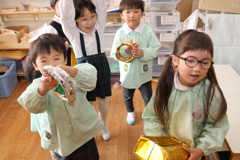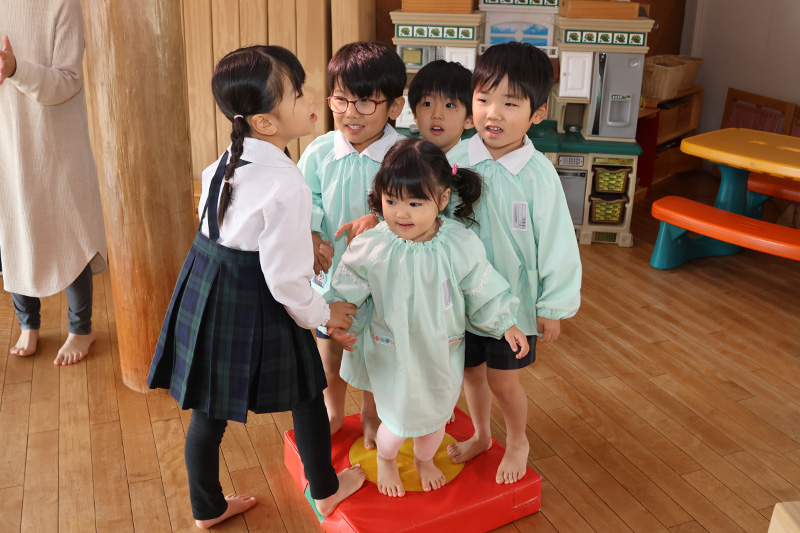 今日は錦華っ子が4つの縦割りグループに分かれて遊ぶたけのこタイムでした٩( ᐛ )و。異年齢の友だちとペアやトリオを組んで、それぞれのグループでゲーム(積み木遊び・宝探しゲーム・色とりゲーム・ダルマさんが転んだ)をして遊んでいます。どのグループでも、年下の子が楽しく遊べるように年上の子が優しく寄り添いながら遊んでいます。年下の子は、そんな優しさに触れながら安心していつもと違う環境でも楽しく遊んでいます。みんなが楽しみにしているたけのこタイムです。