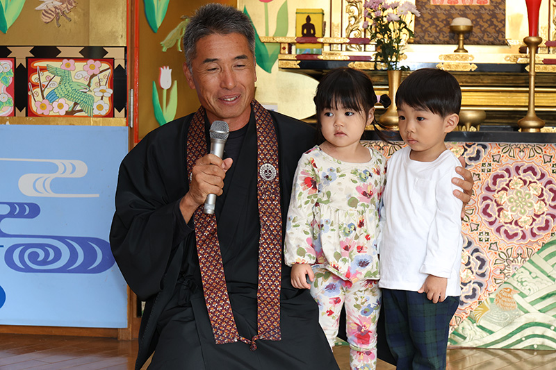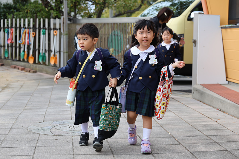 おまいりのあとで、七五三にちなんで担任とのツーショット写真撮影をしました。欠席児は登園した際に撮影します。写真は後日、育友会からのプレゼントとしてお渡しいたします。