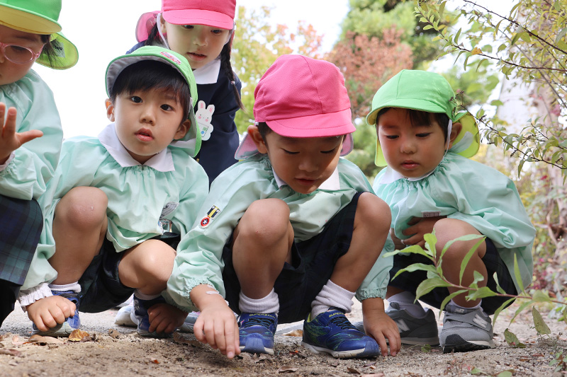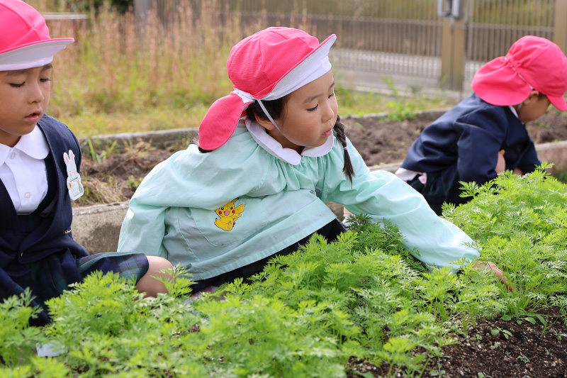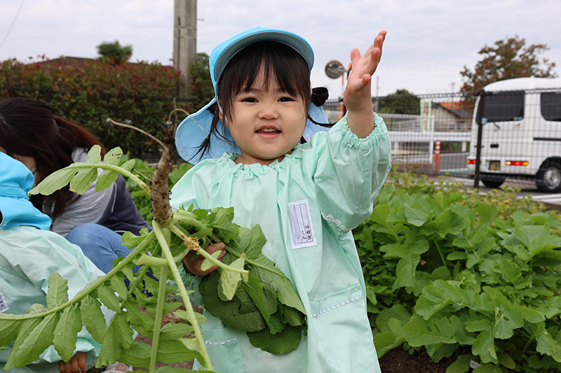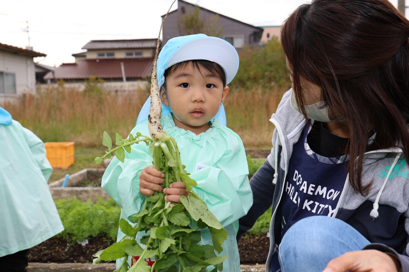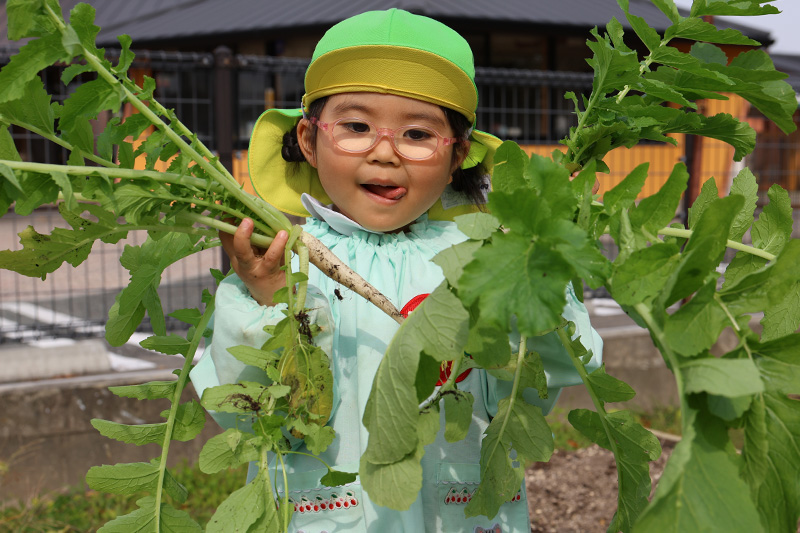 つぼみ組に二人の新入園児が入りました٩( ᐛ )و。登園直後は、不安や緊張があって当たり前。表情が硬かったり、涙が出ることもありましたが、大根の間引きをする頃には自然と笑顔も出ていました。おまいりでの自己紹介では、上手に好きな食べ物は?の質問に二人とも上手に答えることができていました。これからたくさん遊びましょうね〜!
