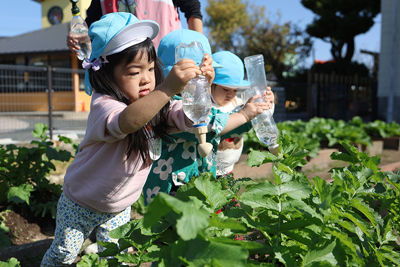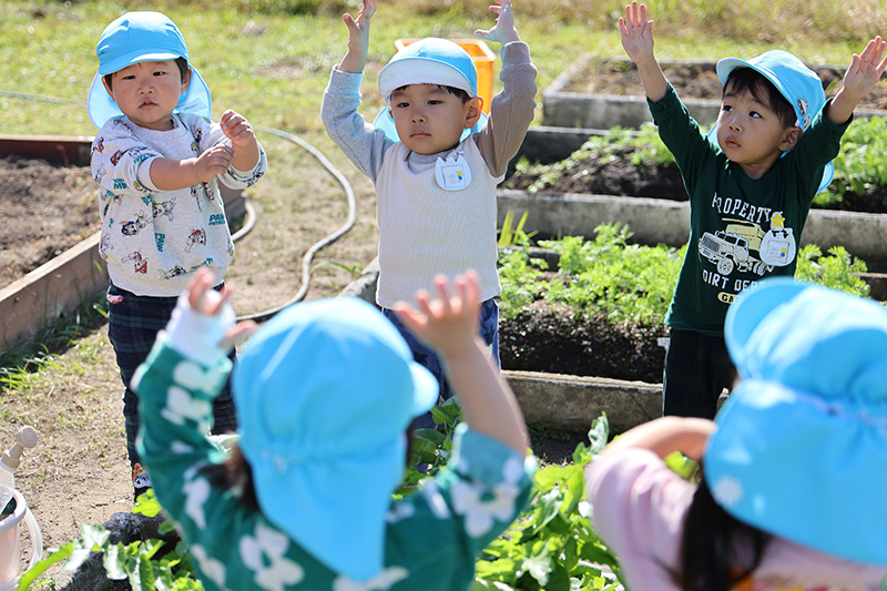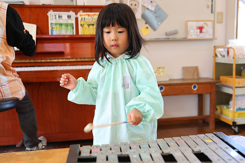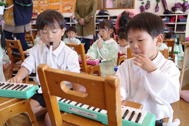 すみれ組、鍵盤ハーモニカに触れています。扱い方や歌口のくわえ方など話を聞いてから『ド・レ・ミ・・・』の音の階段をみんなで鳴らしてみました。もも組は発表会で自分がやってみたい楽器を探るべく、曲に合わせて順番に音を出しています。その様子を見ていたら、だんだん楽器ごとに音の出し方も上手になってきて、すでになんだか合奏っぽく聴こえてきます♪
