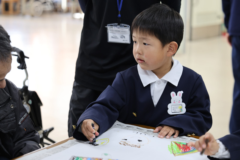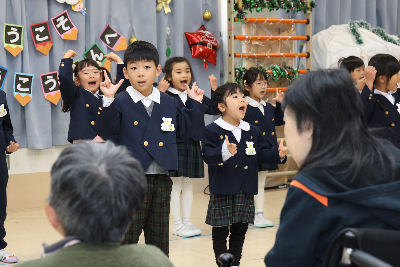 今日16日は、さくら組とすみれ組は障害者支援センターの長光園へ交流に出かけてきました。発表会直後の交流ですので、合唱とそれぞれの遊戯を披露させてもらいました。利用者の皆さんは、手拍子をしたり体を揺らしたりしながら温かく応援していらっしゃいました。それから初の試みで、グループに分かれてから利用者さんたちの似顔絵を描きました。チラチラと恥ずかしそうに利用者さんの顔を見る子もいれば、じっくりと向き合って描いている子もいました。名前を書いてあげてね、と言われた子どもたちは「おなまえ、なんですか?」と尋ねてから似顔絵の横に名前を書いていました。今回もまたお互いに心を通わせることができた温かな交流とさせていただきました。長光園の皆さん、ありがとうございました。