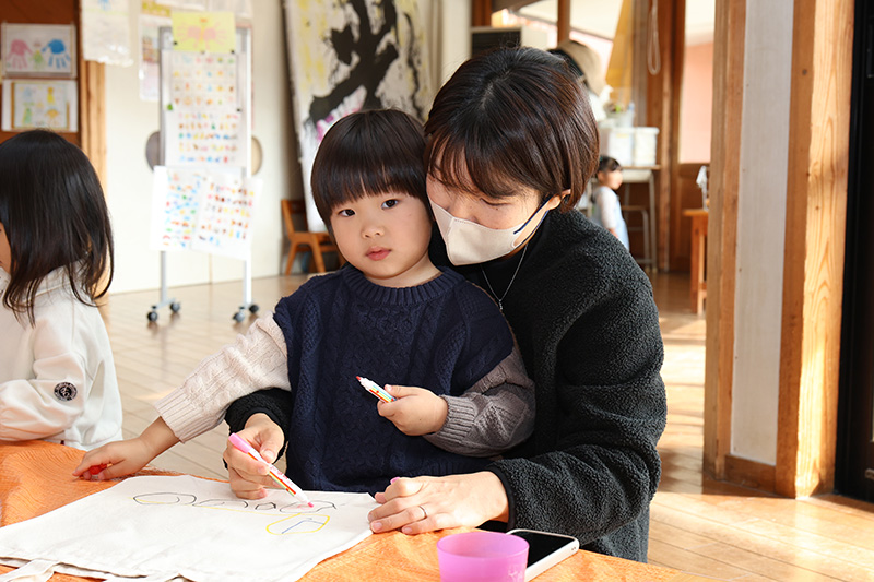 まわりにも子どもたちがペンでお絵かき〰️🌟みんなの小さい手型・足型がゾウやキリンやライオン、花束やミキサー車や恐竜になったりして、世界に一つのすてきなバックが出来上がりました。手型・足型ってなかなかとる機会がないですよね⁈ 今ならではの小さい手・足。思い出の一つとしてぜひ使ってくださいね🌟🌟