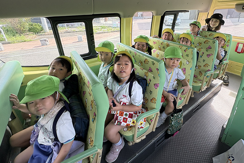 幼稚部のホールに戻ってしっかり水分補給をしてからお昼のお弁当ლ(´ڡ`ლ) 。食後は先日のさくら組同様、積み木や大型ブロック、トンネルの遊具でたっぷり遊びました。ホールに貼ってある指文字表を見て自分の名前に挑戦している子もいました。帰りのバスの中ではウトウトしてしまうくらい元気に遊んだもも組さんでした。