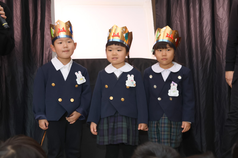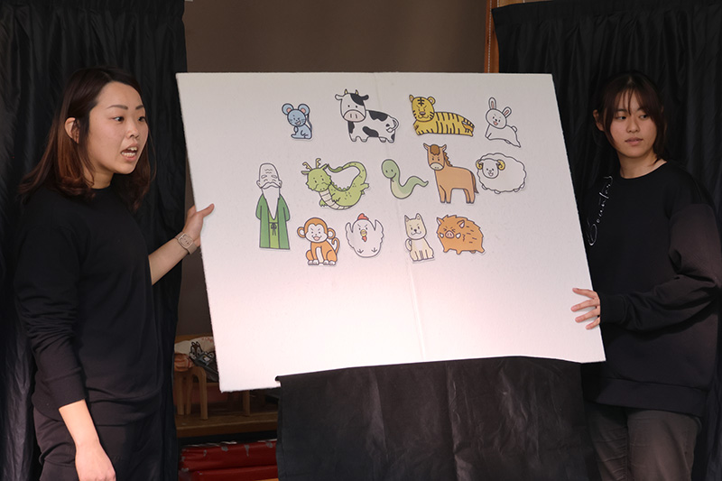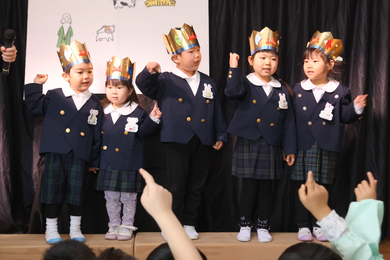 先生たちの出し物は新年1月の誕生会ということで十二支のお話。子どもたちにわかりやすくパネルシアターとスペシャルゲスト?の登場で十二の動物が一年ごとに交代しする順番が決まる様子を伝えています。スペシャルゲストは自分の干支の動物に扮した先生たちやさくら組さん。動物の動きを真似て面白おかしく登場する先生たちの姿に大笑いの錦華っ子でした。改めて「自分は◯◯年なんだ」と知ることができたようです!?