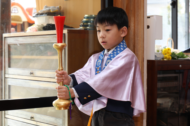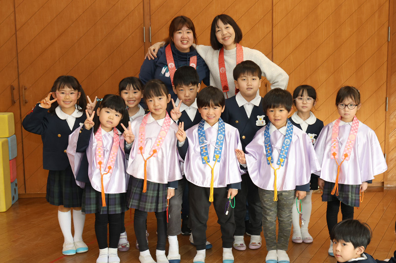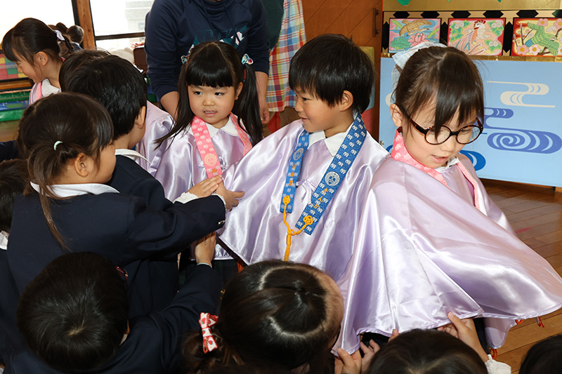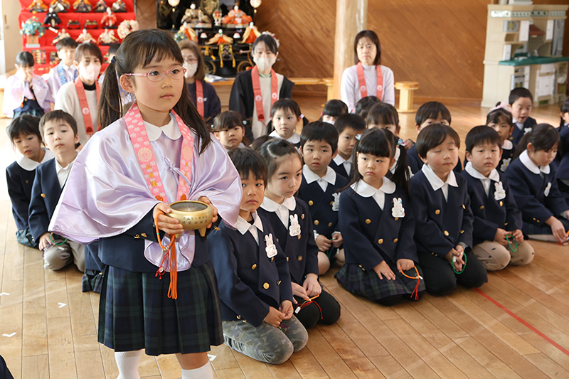 今日はおまいりの日でした。さくら組が参加して扉と献灯献華献香を務めるのは、とうとう今日が最後となってしまいました。毎回、丁寧に真剣に務めてくれていたさくら組。今日はいつも以上に心を込めて凛とした表情で『さくら組のお仕事』を全うしてくれました。卒園式の献灯献華献香からは、そんな立派な姿勢をしっかりと見届けていたすみれ組さんに引き継がれていきます。おまいりの後の引き継ぎ式ではガウンと式章がすみれ組へと渡されました。さくら組さん、今までありがとう!すみれ組さん、これからよろしくお願いします!