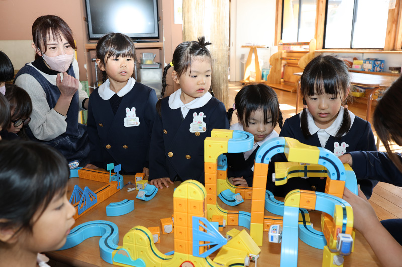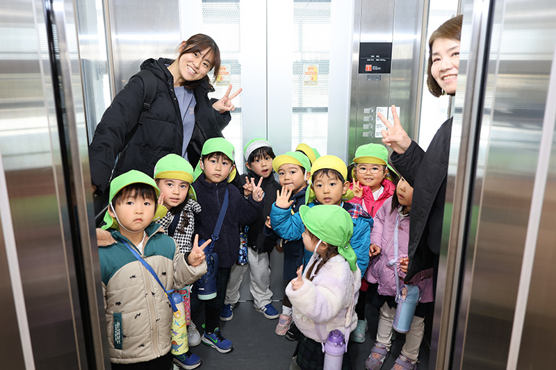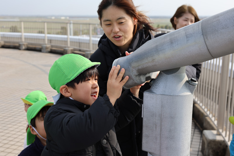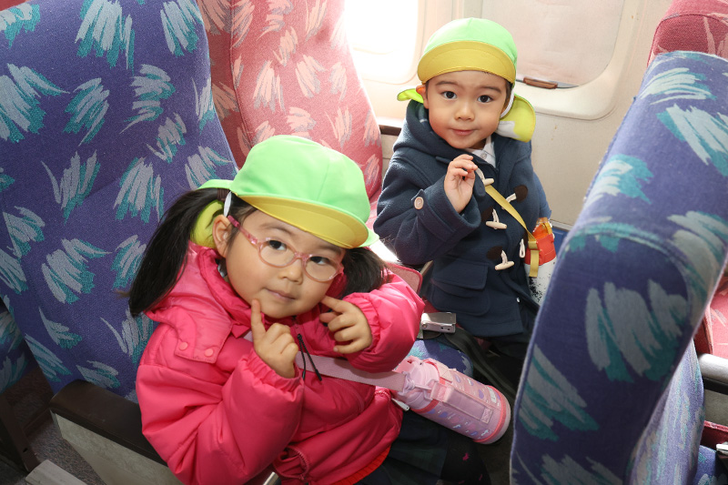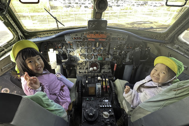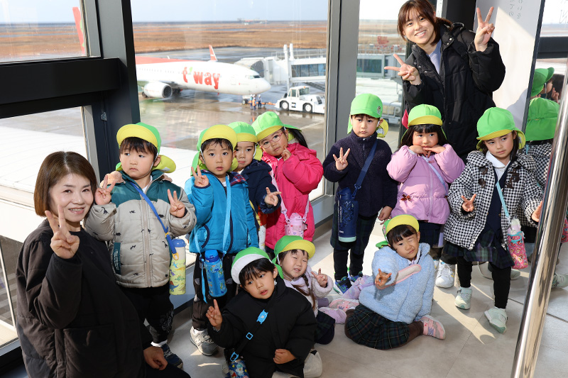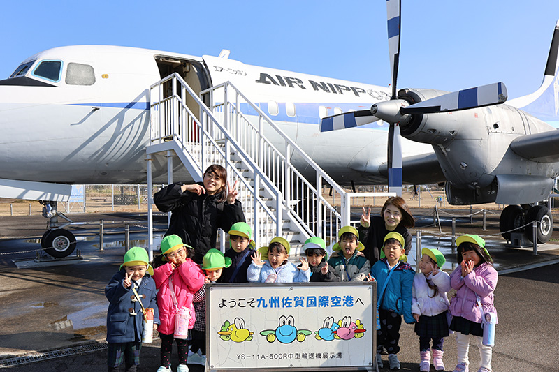 今日は、もも組が園バスに乗って佐賀空港&空港公園へ出かけてきました。ターミナルビルの2階に上がるとすぐに駐機中の飛行機が2機見えました。窓ガラスにへばりついて興味深そうに飛行機や周囲の作業車を観察するもも組さんでした。それから今度はエレベーターで屋上の展望デッキへ。滑走路だけでなく佐賀平野と有明海までを見渡す開放的な景色に歓声をあげる子も。隣接する自衛隊の駐屯地に駐機しているオスプレイや着陸するヘリコプター、飛び立つ小型飛行機なども見ることができました。お目当てだった韓国行きの飛行機が離陸するのを見送ってから、お次は空港公園へ移動。かつて純国産旅客機として活躍したYS-11の静態展示の見学をさせていただきました。事前の依頼をしていたので機内の中に入って客席や操縦席に座らせていただきました。客席に座った途端にシートベルトを締め出す子もいました。飛行機慣れしているのでしょうか(´∀`;)。見学の後は公園の遊具でひと遊びしてから幼稚園への帰途につきました。楽しかったねぇ!