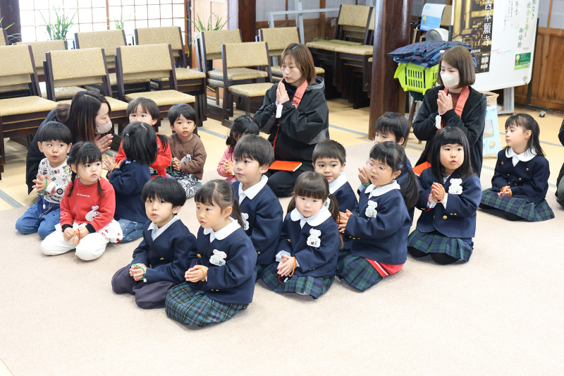 今日は正教寺の本堂で報恩講を勤めました。報恩講は、浄土真宗の各寺院や門徒にとって、とても大切な法要とされています。宗祖である親鸞聖人のご命日(1月16日)にちなんで、親鸞聖人のお導きへの感謝の思いから700年を越えて今日まで大切に勤められてきたのです。おつとめの後、子どもたちには『恩』や『おかげさまでありがとう』の話を園長から伝えています。