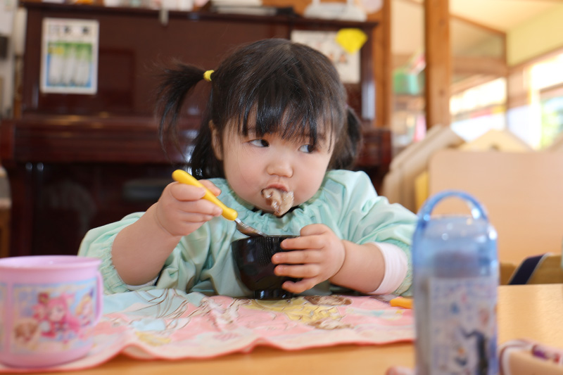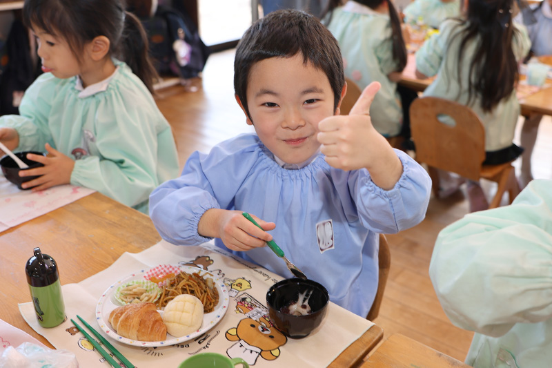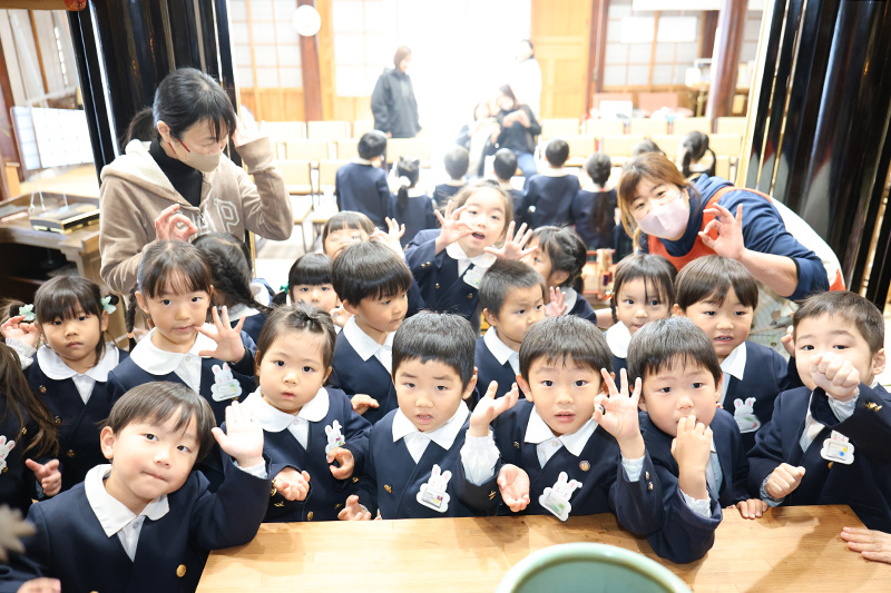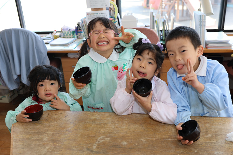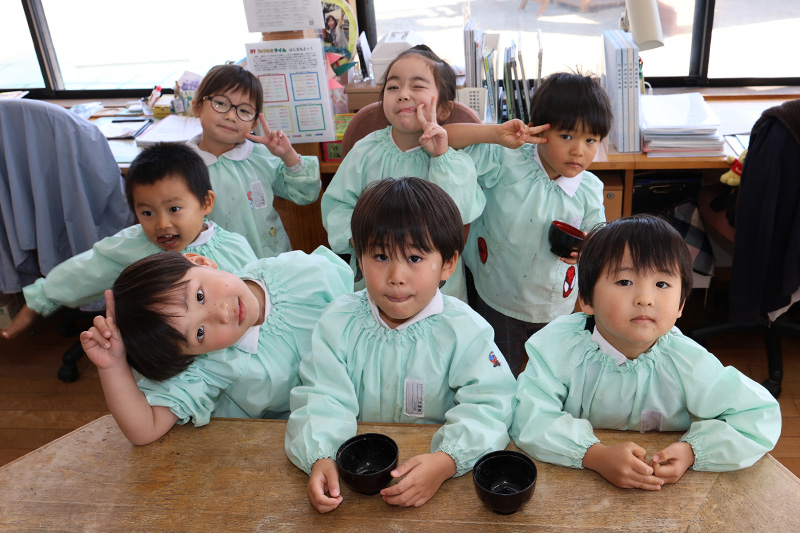 報恩講から幼稚園に戻るともう給食の時間。でも、今日はその前にぜんざいをいただきます。小豆が好物だったと伝えられる親鸞聖人は90歳まで教化伝道に励まれました。鎌倉時代において長命であったのは確かでしょう。そのことにちなんで錦華っ子も健やかであれ、と願いを込めてぜんざいをいただくのです。多くの子がおかわりに来ていましたლ(´ڡ`ლ) 。