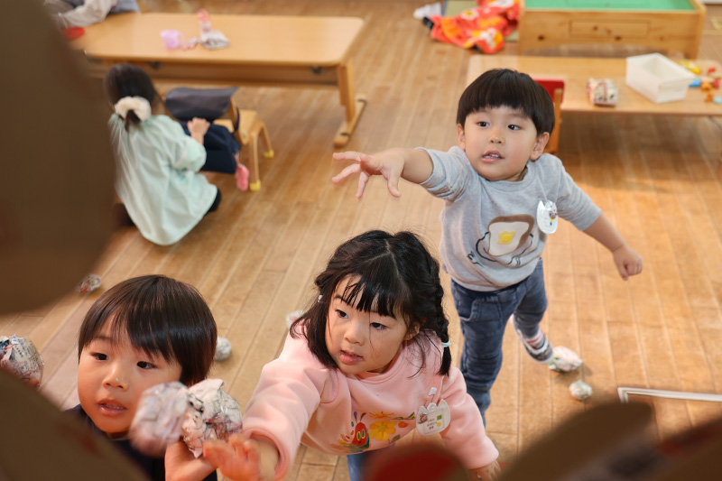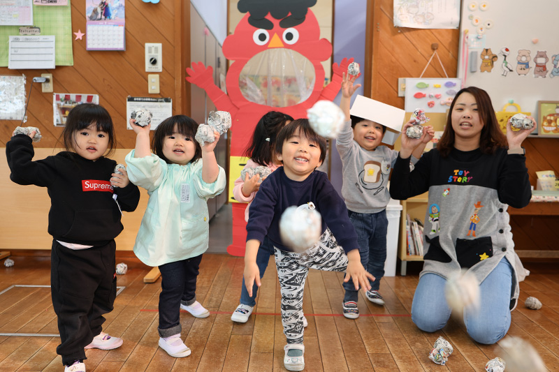 つぼみ組にでっかいオニが出現!?ひと足先に節分の豆まき(の練習?)をしていたつぼみ組でした。オニにも園長にもガンガン豆(紙玉)を投げてくるつぼみ組。2月3日もその調子で頼むよ!