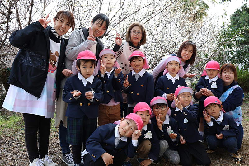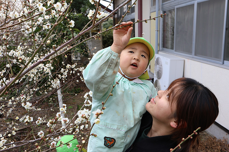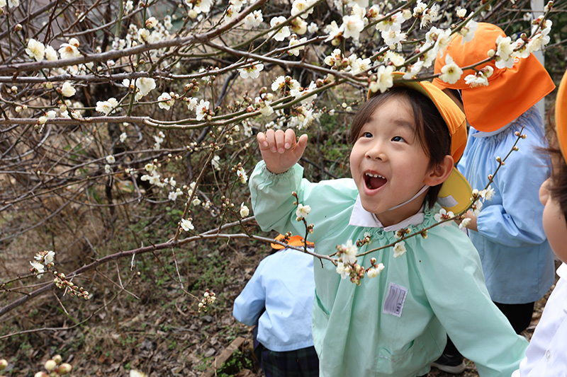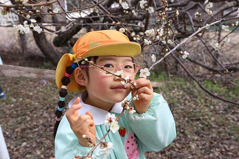 今日は全クラス、旧ホール横の梅の花を見に行きました。バスの車庫の辺りまで行くとほのかに梅の花の香りが漂ってきます。まだ七分咲きぐらいだったのですが、園児の手が届く枝にも花や蕾がついていて、鼻を近づけてクンクンと匂いを嗅いだり、可憐な花の観察をしたりとそれぞれなりに梅の鑑賞を楽しみました。地面に落ちている花びらを拾って、そっと大切そうに手の平に載せて眺めている子もいました。去年の5月に青梅をちぎりに来たことを覚えている子もいて、緑に茂っていた頃との違いに気づいていたようでした。今年もたくさんの実をつけて、みんなで梅仕事ができればいいですねლ(´ڡ`ლ) 。