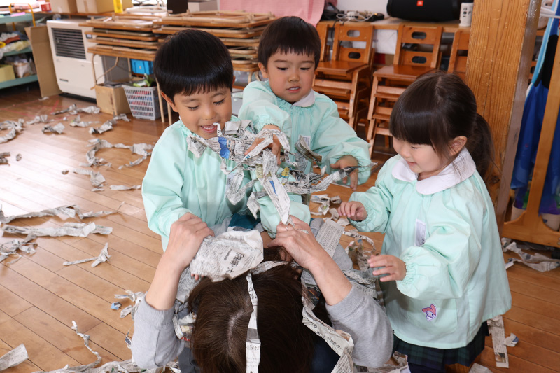 もも組、新聞紙を思いっきり破いて自分の頭の上から降らせたり、友だちや先生を新聞紙まみれにしたりして遊んでいます。床に散らかっている新聞紙をかき集める姿はまるで人間掃除機でした(´∀`;)。存分に身体を動かして楽しんでいました(*´Д`)’`ァ’`ァ。