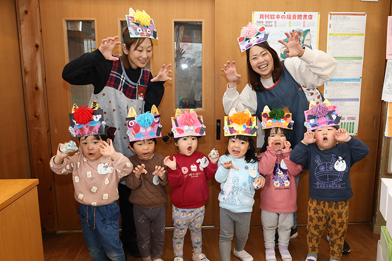 全クラス、豆まき前日恒例の職員室襲撃をやってくれました(´∀`;)。とっても可愛らしい小鬼たちでしたが、園長を怖がらせては意気揚々とクラスへ帰っていきました。錦華っ子のみんな、明日もその調子で頼むぜ!