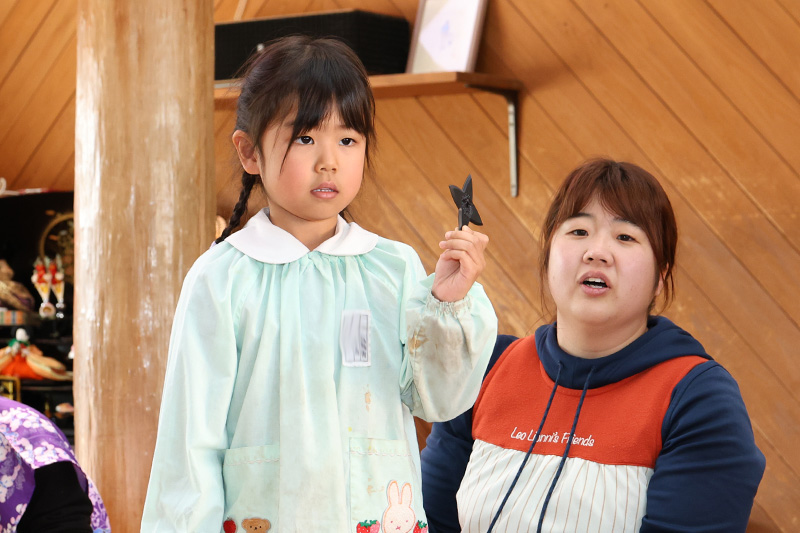 忍者たちと記念撮影の後、すみれ組とさくら組は手裏剣投げの体験をさせてもらいました。錦華っ子ばかりか、観覧の保護者さんたちも大満足の忍者ショーでした。子どもたちに楽しい思い出がまたひとつ加わったことでしょう。バザーの売り上げに協力いただいた皆さん、忍者ショー開催を決定していただいた役員の皆さん、ありがとうございました!