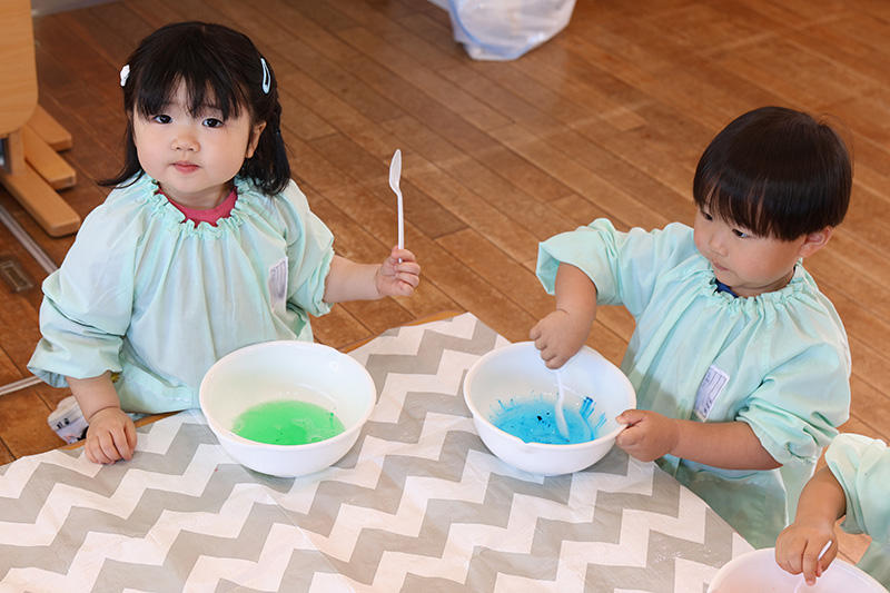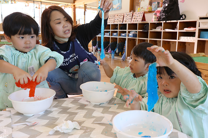 つぼみ組、久しぶりの感触遊びでスライムを作っています。自分が好きな色でスライムを作って遊んだら次は友だちとスライムの混色をして色の変化も楽しんでいます。はじめは触れなかった子も徐々に手に取って感触を味わうことができていました。