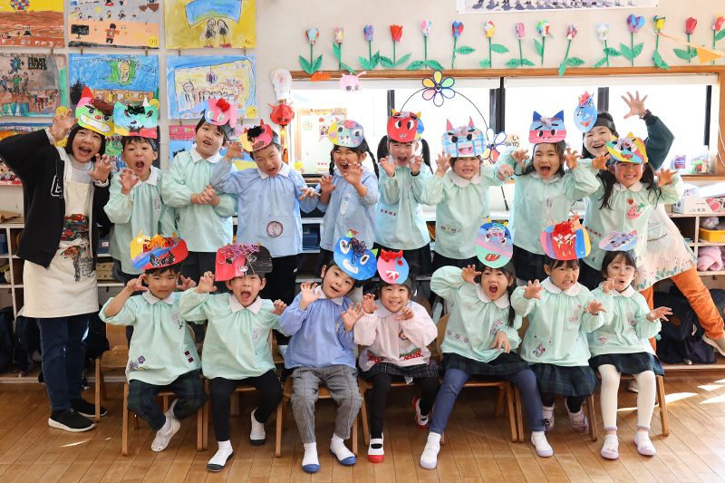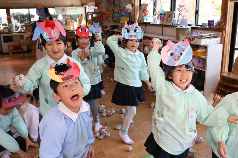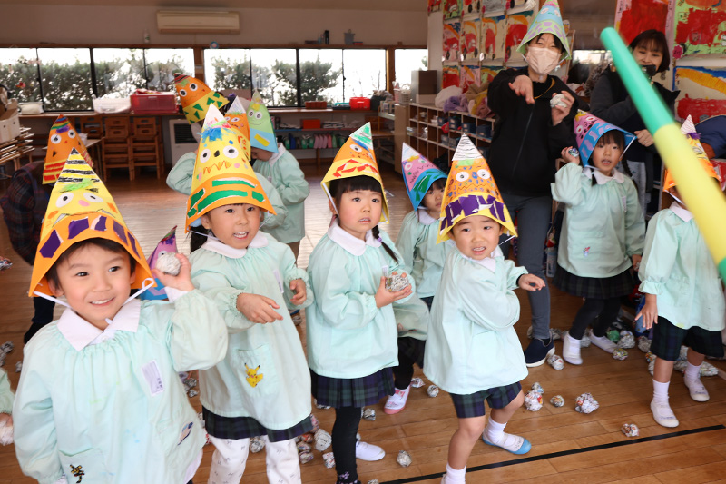 節分の今朝、登園する表情がいつもよりどんよりとした子が多かったような気がしましたが、錦華幼稚園でも豆まきを行いました(´∀`;)。まずはクラスごとにお面をつけて集合写真をパチリ!カメラに向かって「ガオーッ」とポーズを取るときはまだまだみんな元気でした。