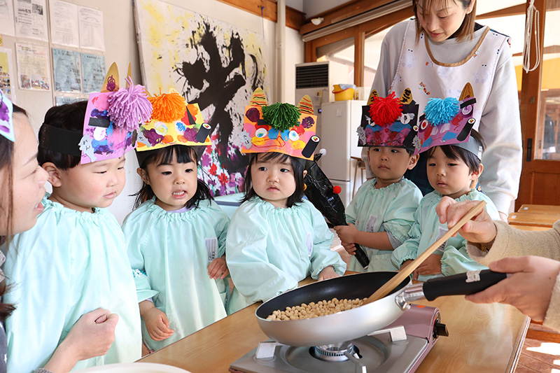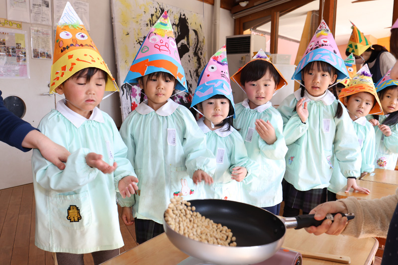 それからホールへ移動して大豆を炒る様子を見つつ香りもクンクン!「鬼はこの香りが嫌いなんだって!」というと、どこかの神社の線香の煙のように体に大豆の香りをつけようとする子もいました。それから園長から豆まきのお話。「鬼たちはみんなの悪い心や弱い心につけ込もうといつも狙っているんだよ」と伝えつつ、中庭側のロールカーテンを上げると初代園長像が鬼に変身してる!?・・・という小ネタを挟みながらお話終了。最後はみんなで「がんばりまっす!」と気勢をあげて元気にクラスに戻りました。