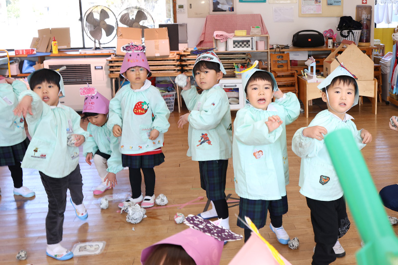 毎年恒例のベタな音響とベタなシャベリが入ってから、いよいよ青鬼と赤鬼が登場!鬼どもは保育室に入らずに廊下から脅かすのみ。それでもやはり怖がる子は奥の方に後ずさったり涙が出たりもしていましたが、それぞれなりに勇気を出して豆(紙玉)を投げることができていました٩(•̤̀ᵕ•̤́๑)。怖がらずに最前線に出てくる子たちは、ガンガン攻撃をしていて鬼の武器やカツラ・・・もとい髪の毛を奪い取るほどの勇猛さでした。鬼の巡行は、もも→つぼみ→すみれ→さくら(折り返し)→すみれ→つぼみ→もも、だったので一度撃退してホッとしたところにまた戻ってきた鬼たちに驚く子もいましたが、さっきのリベンジ!とばかりに勇気を出して頑張って立ち向かう子もいました。どの子もとっても頼もしく思えた錦華っ子たちでした!