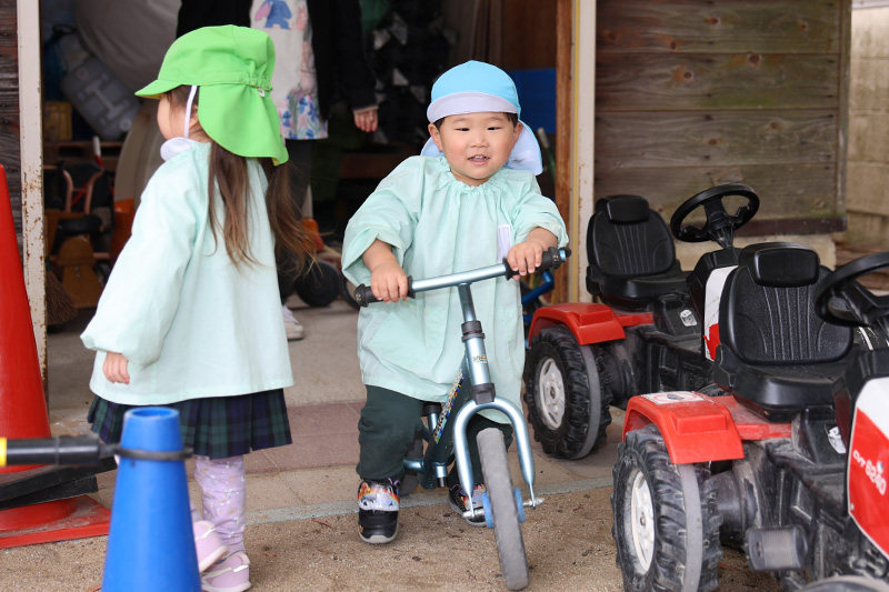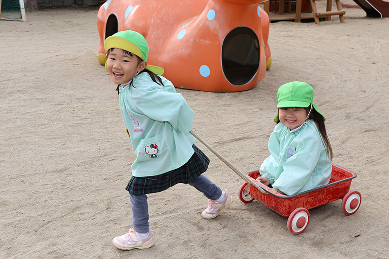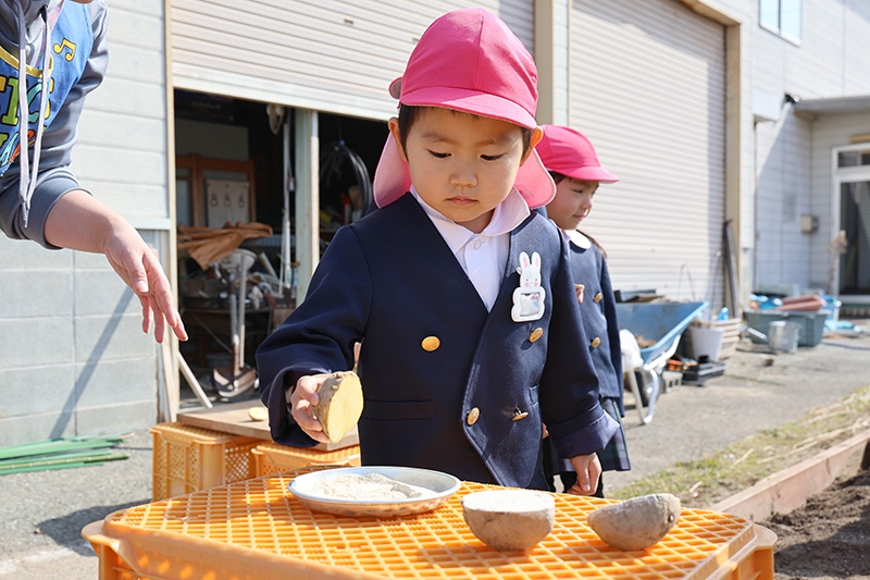 すみれ組はジャガイモの種芋植えもしています。二つに割った種芋の断面に灰をつけて(病害や腐食を防止するため)から畑に植え付けました。さくら組になったときのカレーパーティやお泊まり保育で今日のジャガイモを使用する予定です。今回のジャガイモは『きたあかり』です。すみれ組さん、5月下旬〜6月上旬ごろには収穫を頼むぞ!