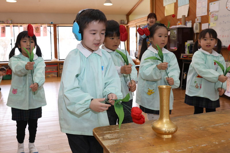 すみれ組、今日から〝さくら組のお仕事〟である献灯献華献香の練習を始めました。いよいよ自分たちの出番か!と言わんばかりにやる気満々の表情で先生の話に耳を傾けるすみれ組さんでした。もちろん、花の持ち方や足の進め方を聞いてもすぐにできるわけではありません。まずは少し離れた花立(はなたて)まで歩みを進めることから始めています。とっても意欲高く練習していたすみれ組です。きっとすぐに上手になることでしょう。