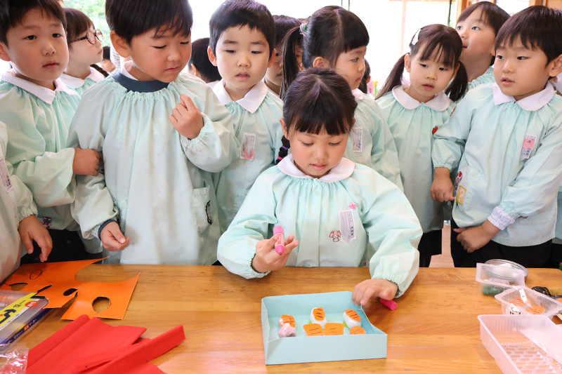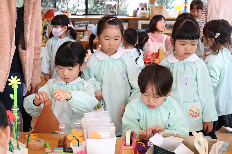 さくら組、今日もワイワイとプロジェクト活動の制作を進めています。すみれ組がその様子を見学に行ったのですが、さくら組さんのアイデアや表現力、クオリティの高さに「さくらさん、すごい!」と感心しきりな様子でした。きっと、いつかはぼくたち、わたしたちも!と思ったことでしょう。