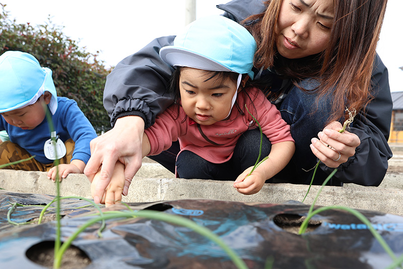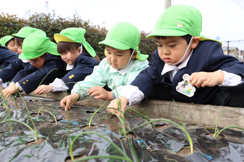 全クラス、タマネギの苗植えをしています。黒いマルチを張った畑に、自分の指で穴を開けて苗を差し込んで、根っこがすっぽり隠れるように土の布団を寄せてあげました。ジャガイモ同様に5月下旬〜6月上旬に収穫予定です。
