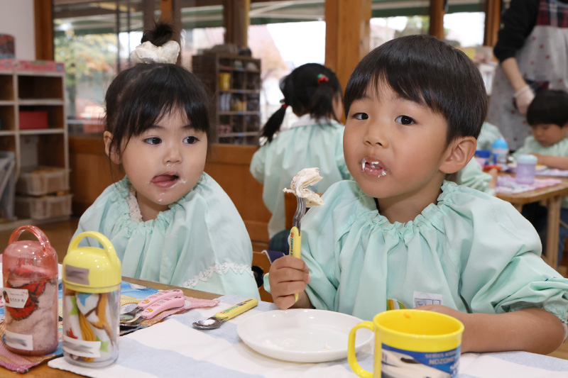もも組とつぼみ組は合同で今年度最後のクッキング『ミルクレープパーティ』をしています٩( ᐛ )و。事前に先生たちが焼いていたクレープ生地の上に子どもたちがクリームを上手に塗り広げて12層のミルクレープを作りました。ちょいとホールでひと遊びしている間に冷蔵庫で冷やしておいたミルクレープは見るからにしっとりとしていて美味しそうლ(´ڡ`ლ) 。先生たちにお皿に切り分けてもらって、パインとイチゴとクリームを添えたら「いただきます!」。口の周りにクリームをつけながら頬張る姿はとっても幸せそうでしたよ!