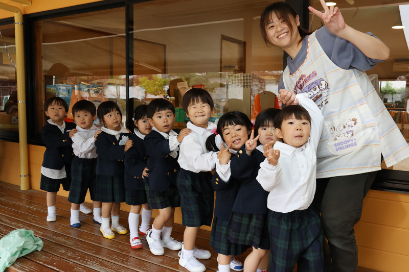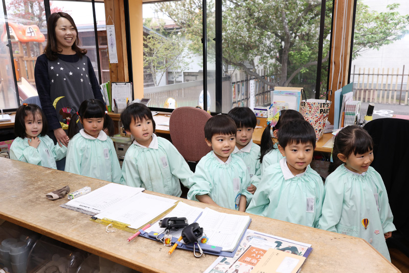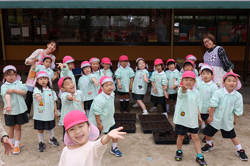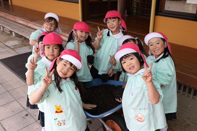 今日は曇り空からの雨模様。思うように外遊びができませんが、さくら組はオーニングの下でポットの土入れをしてくれました。毎年、さくら組が全クラス分の土入れをしています。多めに苗を作って元気なものを畑に定植するのが良い野菜を作る基本です。21人全員出席のさくら組、みんなやる気満々で手伝ってくれました。その数なんと122個!ありがとうございました。おかげで園長が楽をさせてもらいました。それからさくら組は雨が降り出す前に園外探検。外の遊具の遊び方のルールを改めて伝えています。