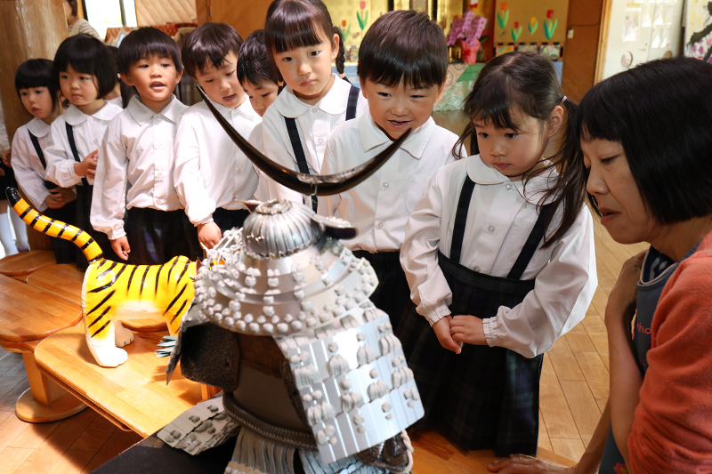 今日は全クラス、ホールに飾っている五月人形(鎧・兜)で担任と園児のツーショット写真を撮影をしています。園児が被れるような兜と着ることもできる羽織が対となった五月人形は園児の祖父母様からいただいたもの。そして、つい先日、卒園児(51歳!)から「よかったら飾ってください」といただいた伊達家の銀色の鎧兜も一緒に飾っています。かっこいい鎧兜に興味津々の錦華っ子たちでした。健やかな成長を願って撮影した写真は育友会からのプレゼントとして後日、お渡しいたします。