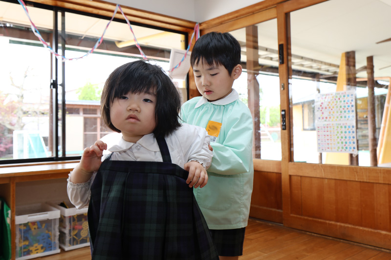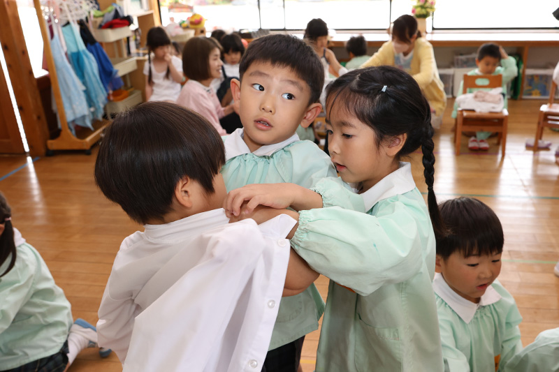 つぼみ組やもも組の脱ぎ着をさくら組が手伝ってくれました。そんなさくら組さんたちも、つぼみ組やもも組の頃にさくら組さんから手伝ってもらっていたのです。受けた親切や優しさは受け継がれていきます。