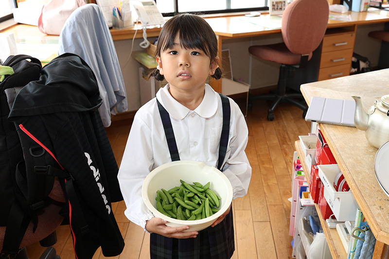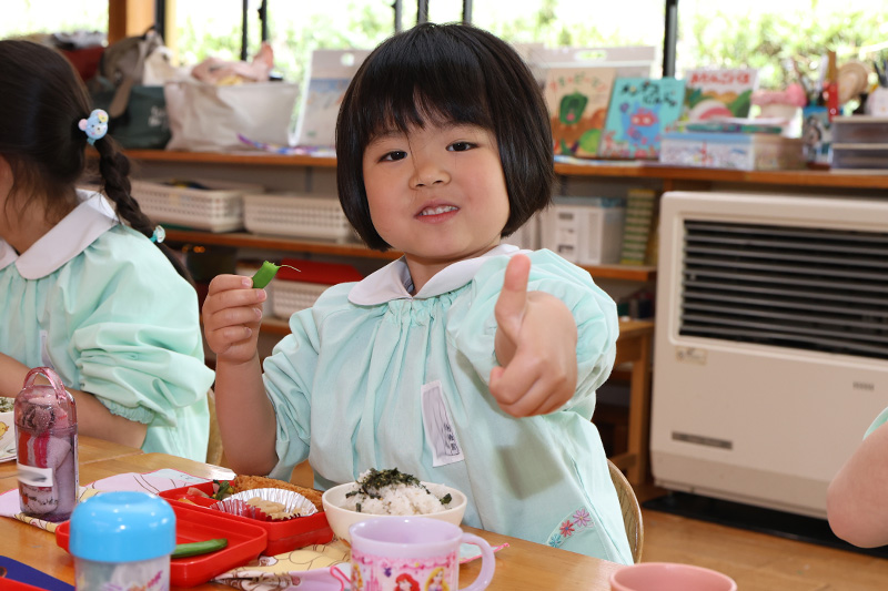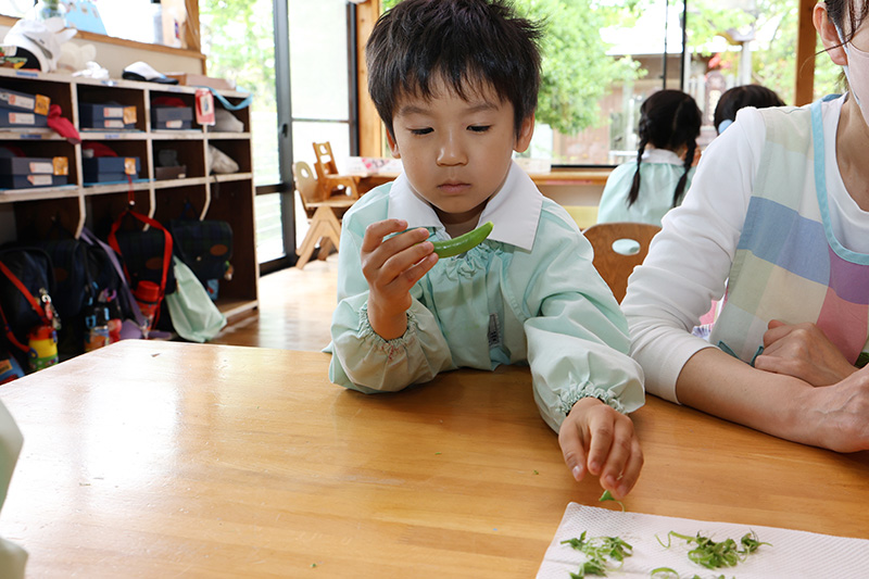 さくら組、ゆか先生が実家から持ってきてくれた旬のスナップエンドウのスジ取りに挑戦٩(•̤̀ᵕ•̤́๑)。取り方を教わって真剣な表情でスジ取り開始。みんな上手にできていたようですよ。職員室で茹でて、茹でたてのスナップエンドウを「いただきまーす」ლ(´ڡ`ლ) 。春の美味しさが弾けるスナップエンドウでした。すみれ組、もも組、つぼみ組にもお裾分けをしています。
