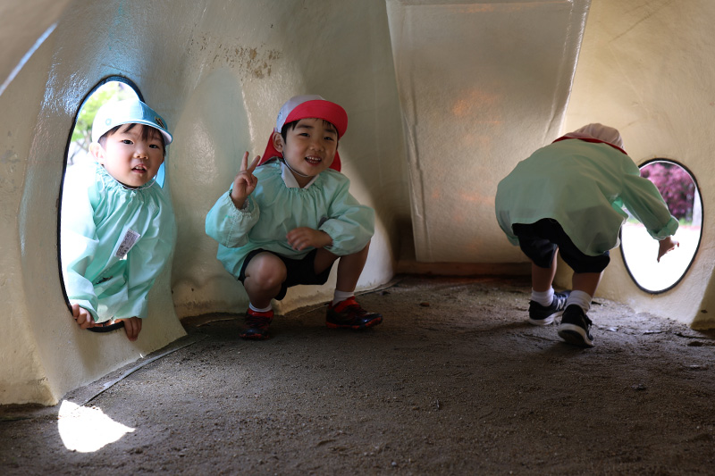 待ち遠しかった青空!鯉のぼりも気持ちよさそうに泳いでいました٩( ᐛ )و。外遊びも元気いっぱい♪乗り物の遊具で走り回ったり、砂場でクッキングしたり、かくれんぼしたり、ダンゴムシを集めたり・・・(´∀`;)。自分がやりたいことを見つけて存分に楽しんでいましたよ。