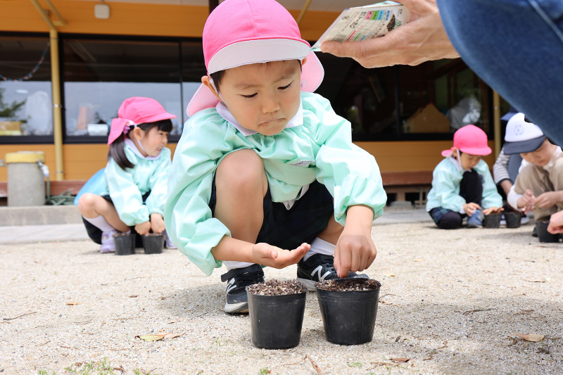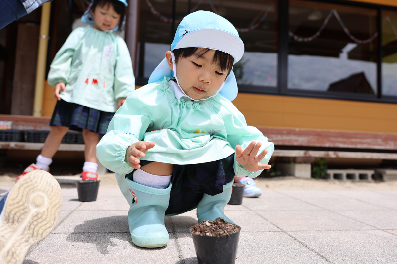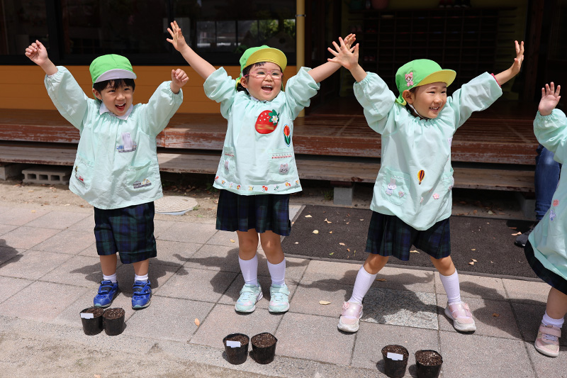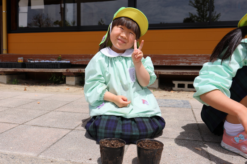 全クラス、ポットに種まきをしています。それぞれに育てる野菜の名前も決定しました!さくら組はキュウリの『スーパースター』、すみれ組はオクラの『らくかくちゃん』、もも組はトウモロコシの『こーんちゃん』、つぼみ組は同じくトウモロコシの『こっしー』です。野菜名や品種名にちなんでいると思います・・・多分(´∀`;)。上手に種まきをした後は、みんなでポットを囲んで「大きくなぁれ!」の愛情シャワーをかけました。これから観察とお世話を楽しもうね!