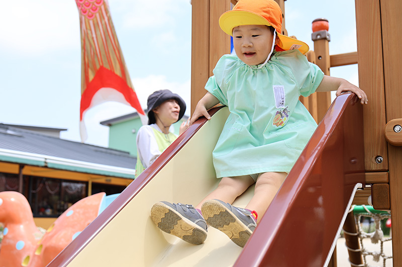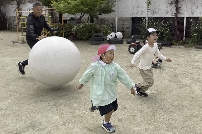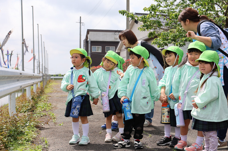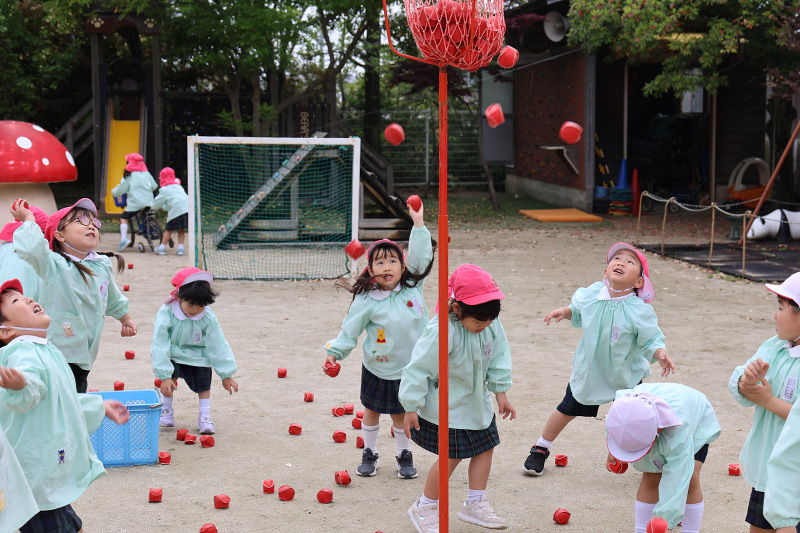 今日は晴れ!外遊びに好適なお天気でしたね。さくら組は遊具倉庫から玉入れのカゴや大玉を引っ張り出してきて、存分に大玉転がしや玉入れをして遊び込んでいました٩( ᐛ )و。すみれ組は陽気に誘われ?急きょのプチお出かけ!巨勢公民館の東側クリークに吊ってある鯉のぼりを見てきました。それから巨勢公園でひとしきり遊んで帰ってきましたよ。