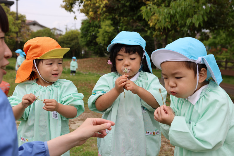 昨日のすみれ組に続いて、今日はもも組とつぼみ組が巨勢公民館東側の鯉のぼりを見に行きました。昨日よりも程よい風が吹いて気持ち良さそうに泳ぐ巨勢の鯉のぼりでした・・・が、やはり今日も子どもたちの視線を釘付けにしたのは甲羅干しをしている亀でした(´∀`;)。それから近くの巨勢公園へレッツゴー٩(•̤̀ᵕ•̤́๑)。安全面の見守りに配慮しながら滑り台や機関車の遊具で楽しいひとときを過ごしました。タンポポの綿毛を懸命に「フゥッ」と吹く可愛い姿も見られましたよ。