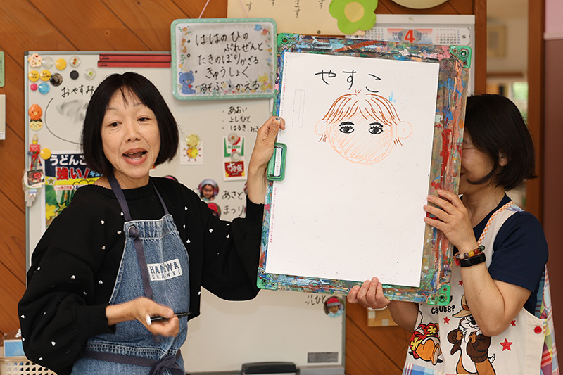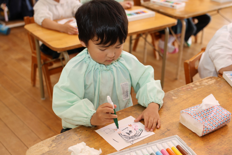 さくら組やすみれ組では、母の日のプレゼントに添える似顔絵描きをしています。それぞれにママの顔を思い出しながら描いていたようです。ママのことを思い出して涙がポロリの子もいました・・・。