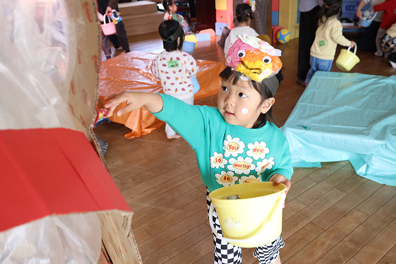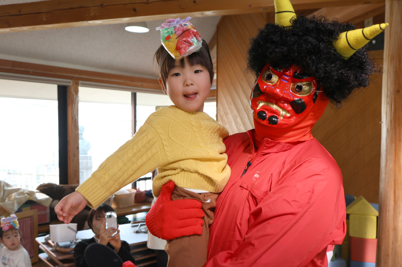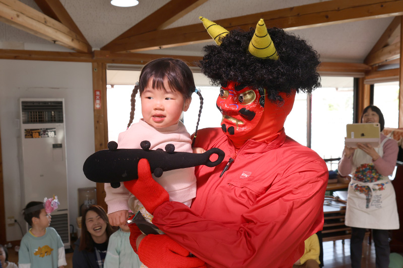 怖がった子もいたけれど、ママの後ろに隠れながらもまめボールを投げ‥見事オニを追い払うことができましたね❣️ 途中、オニに捕まってしまう?(抱っこしてもらっている?)子もいましたが、泣くことなく、肝がすわっている感じ🤣 みんなで最後はオニにハイタッチやバイバイしていましたよ🤗今年はなんだか例年よりも優しくソフトなオニさんだったようです🤭